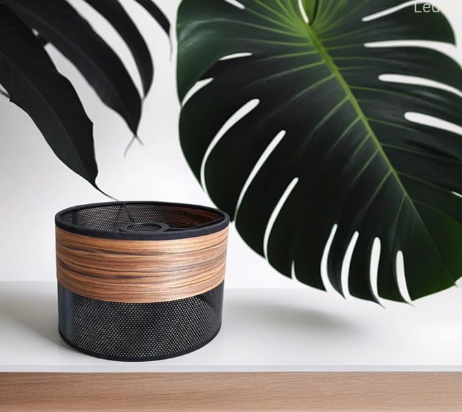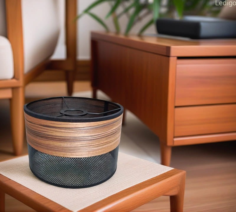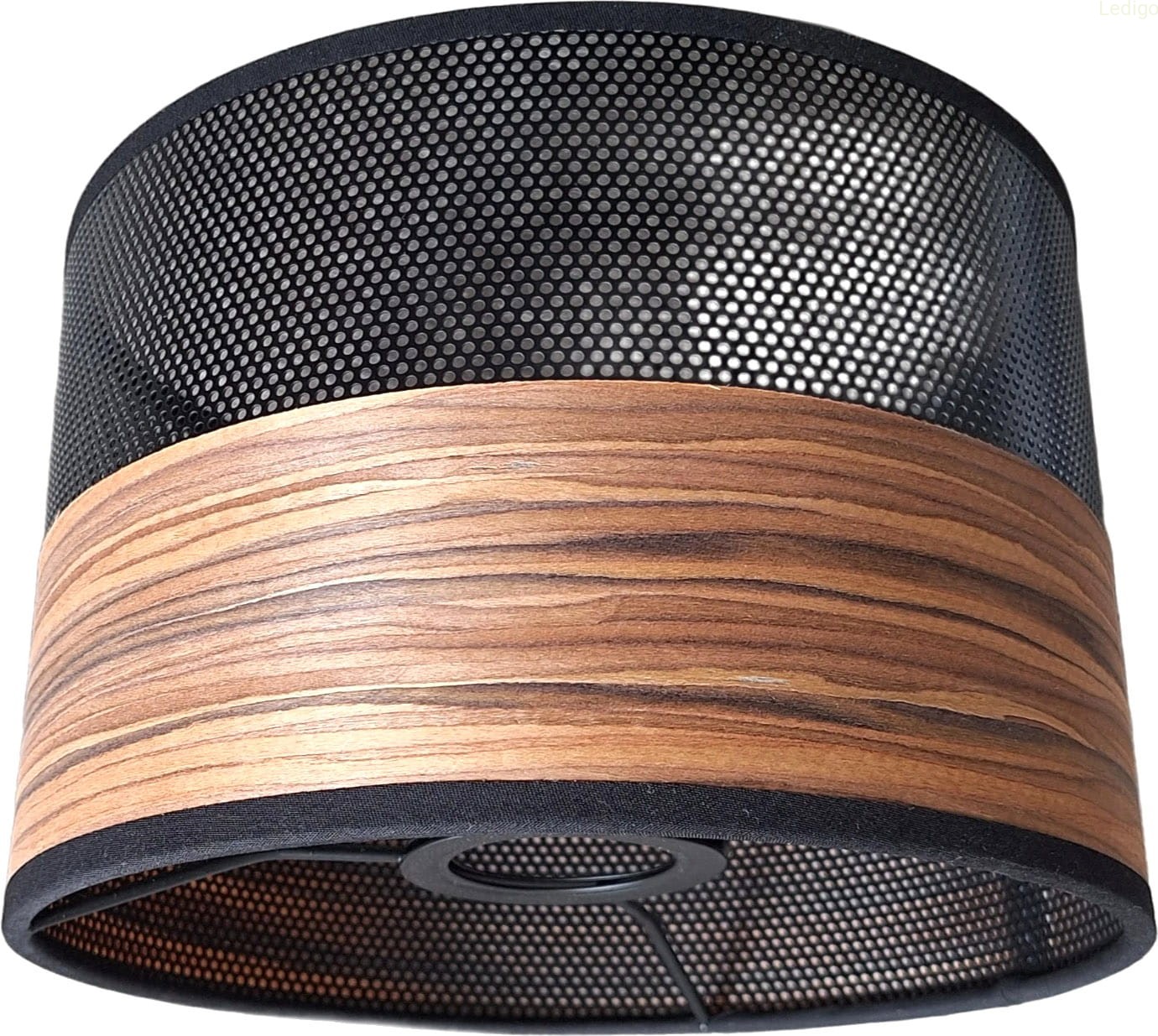 Ażurowy abażur w kształcie walca w czarnym kolorze z elementem fornirowanego dębu. Abażur znajduję świetne zastosowanie zarówno w lampach wiszących, lampkach nocnych czy kinkietach ściennych o dużym gwincie E27.