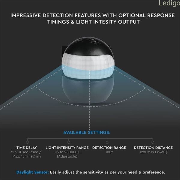 Naścienny czujnik ruchu pozwala na automatyczną pracę wszelkiego rodzaju źródeł światła. Model VT-8028 ma wbudowany czujnik ruchu IR (podczerwień) z regulacją czasu świecenia (TIME) i momentu aktywacji zależnej od pory dnia (LUX) oraz odległości. Urządzenie posiada regulację położenia głowicy. Obudowa z tworzywa sztucznego ma kolor czarny.