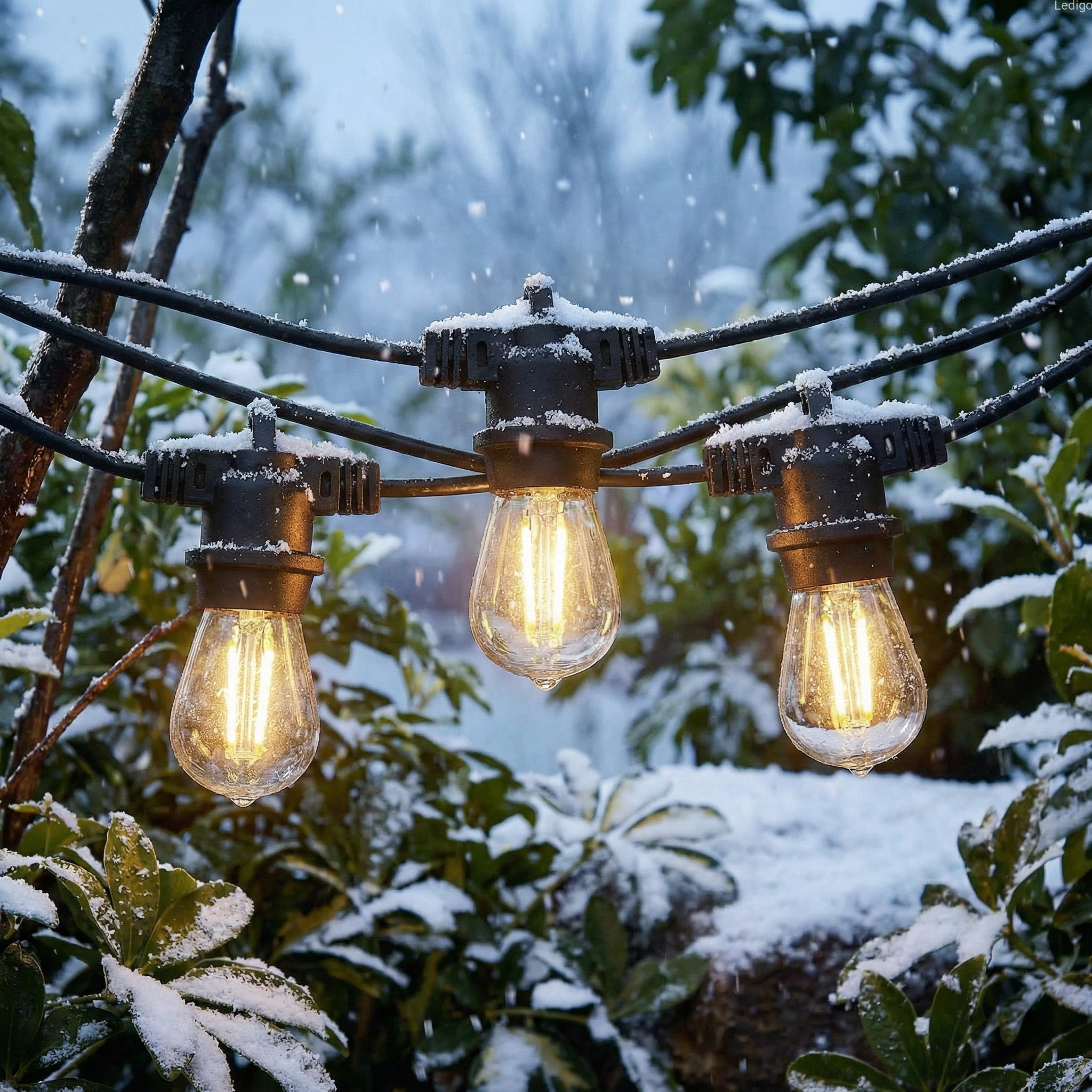 - Zabezpieczenie antywilgociowe: każda z opraw posiada zabezpieczenie dzięki czemu girlanda może funkcjonować na dworze bez względu na warunki atmosferyczne ( mgła czy deszcz)