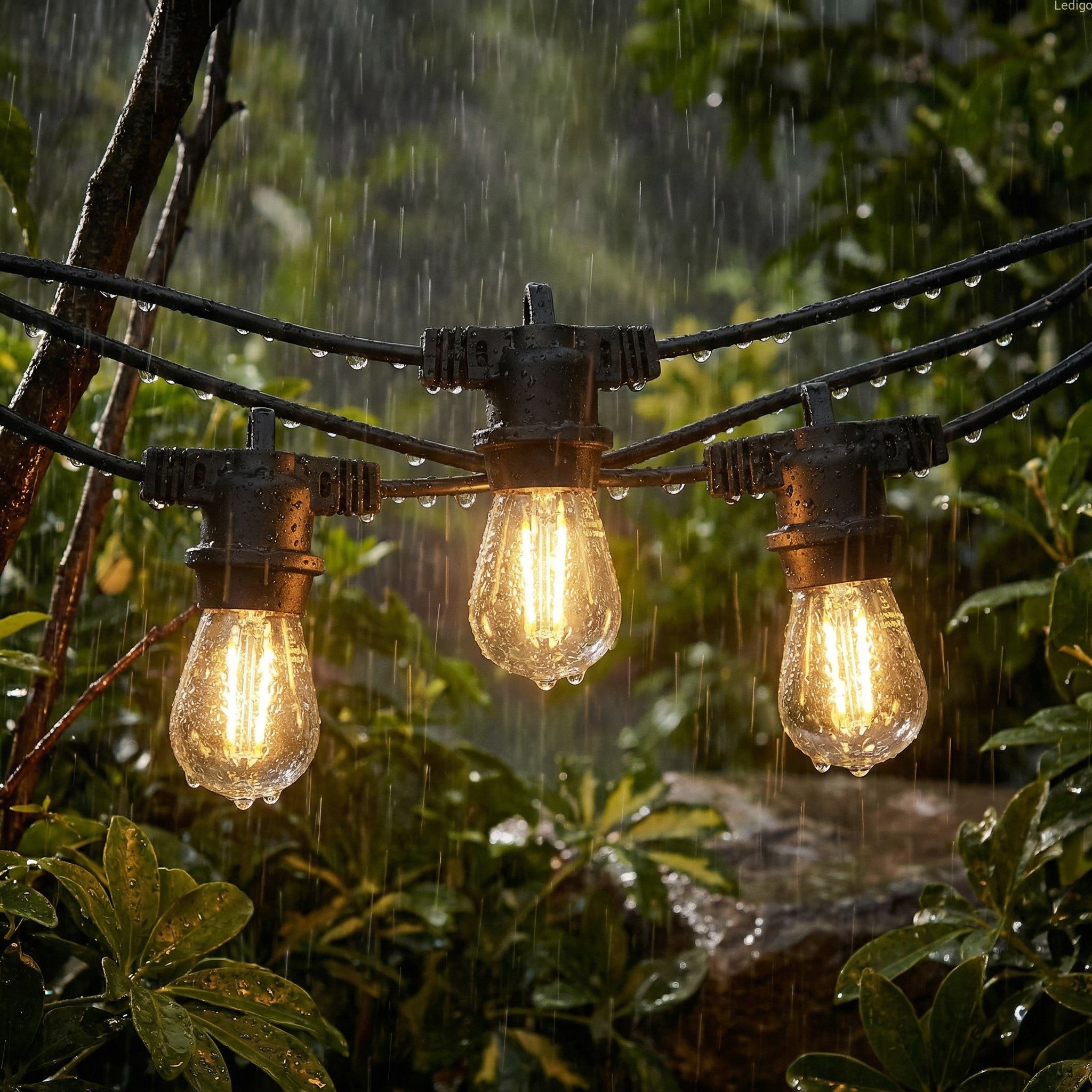 - Zabezpieczenie antywilgociowe: każda z opraw posiada zabezpieczenie dzięki czemu girlanda może funkcjonować na dworze bez względu na warunki atmosferyczne ( mgła czy deszcz)