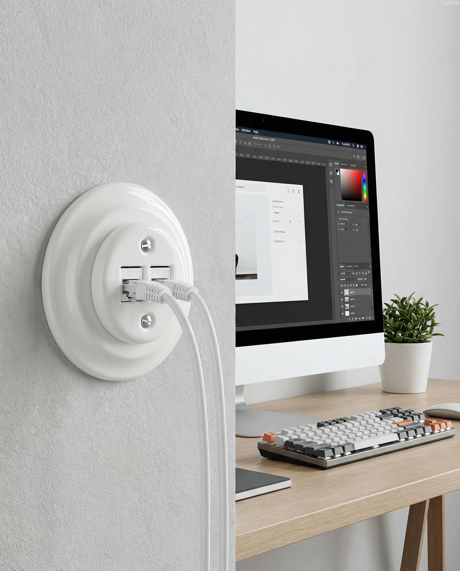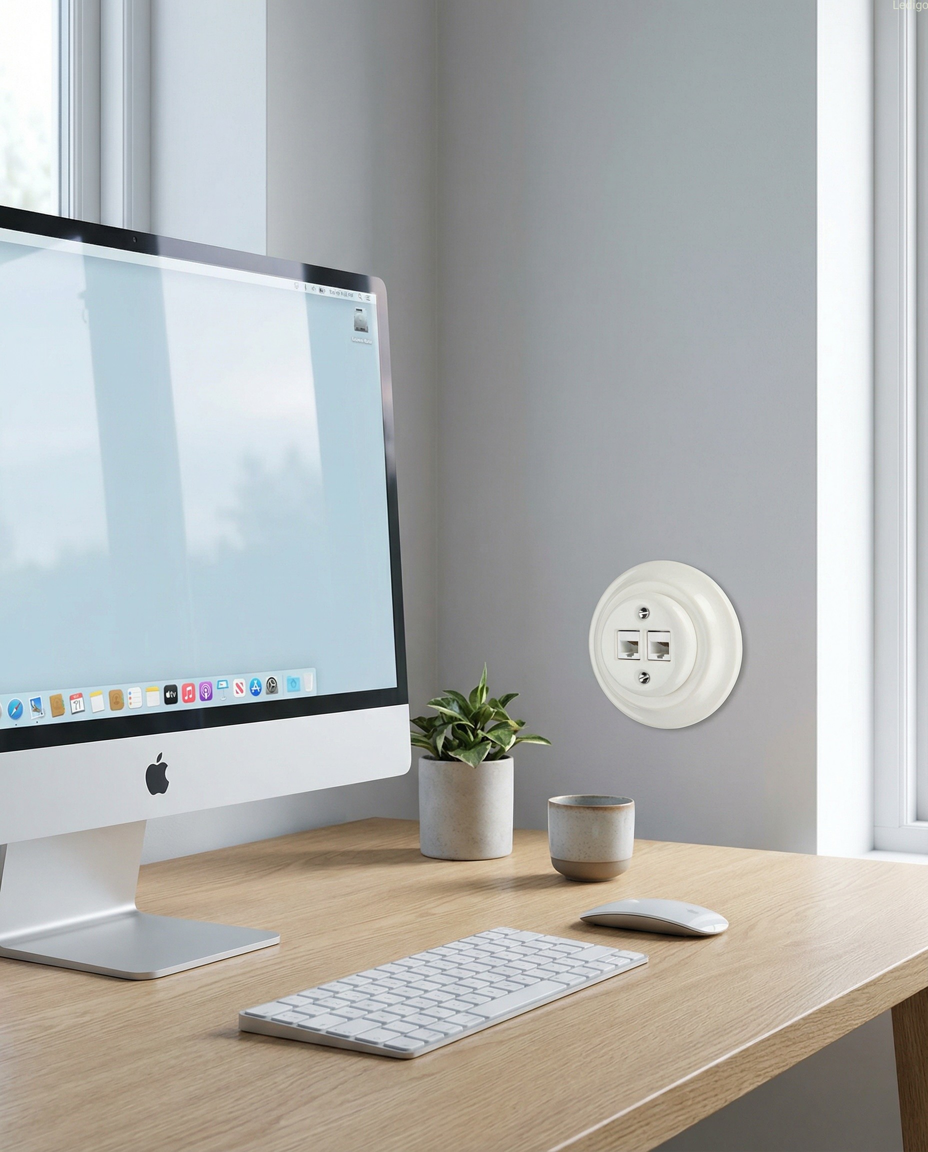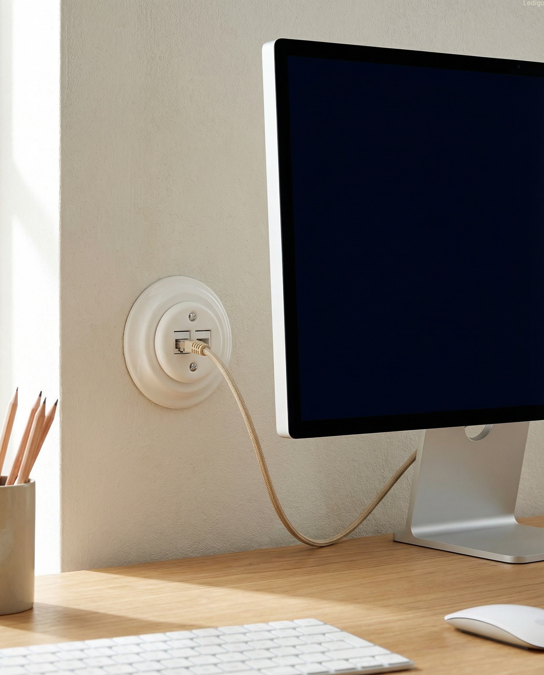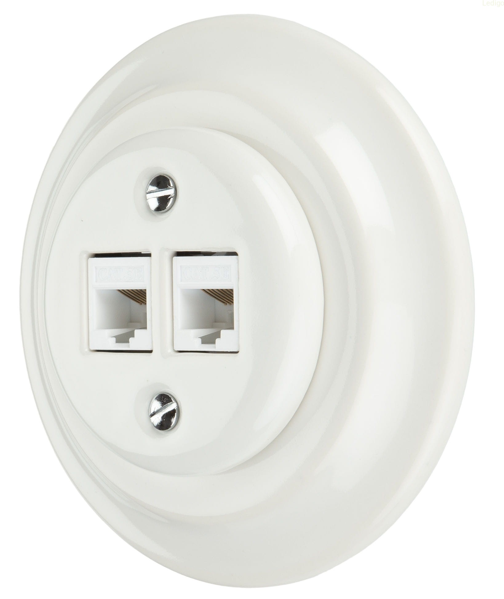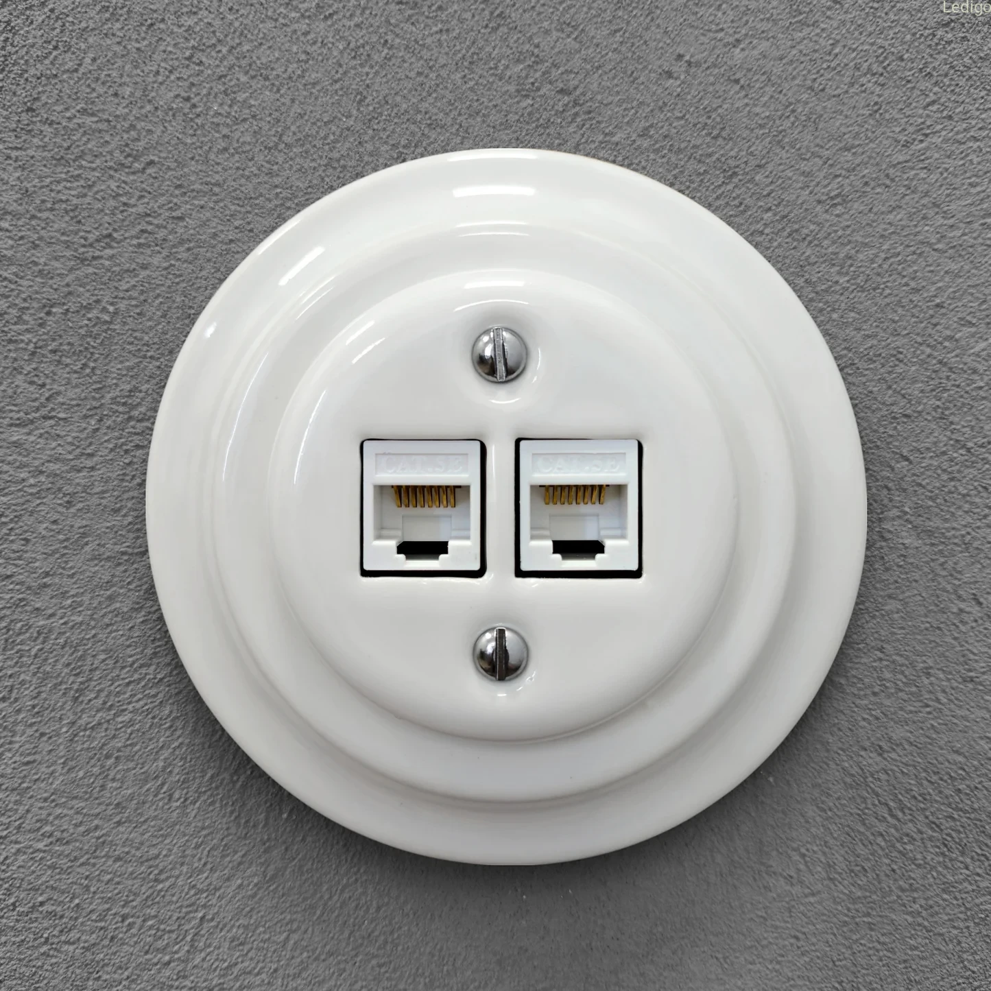 Podtynkowe gniazdo internetowe z ramką w stylu retro wykonane z wysokiej jakości ceramiki powlekanej porcelaną w białym kolorze. Produkt zachwyca klasyczną elegancją nawiązującą do włoskich projektów z przełomu XIX i XX wieku. Prosta forma a zarazem ponadczasowy design sprawia, że po nasze akcesoria elektryczne sięgają nawet najbardziej wymagający klienci.