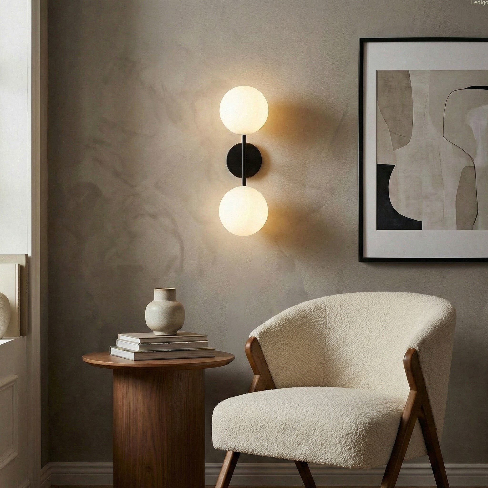 Dwa klosze z mlecznego, matowego szkła przypominają idealne perły. Dzięki swojej strukturze zamieniają surowe światło żarówek w kojącą, miękką poświatę, która nie razi w oczy, a otula pomieszczenie przytulnością.