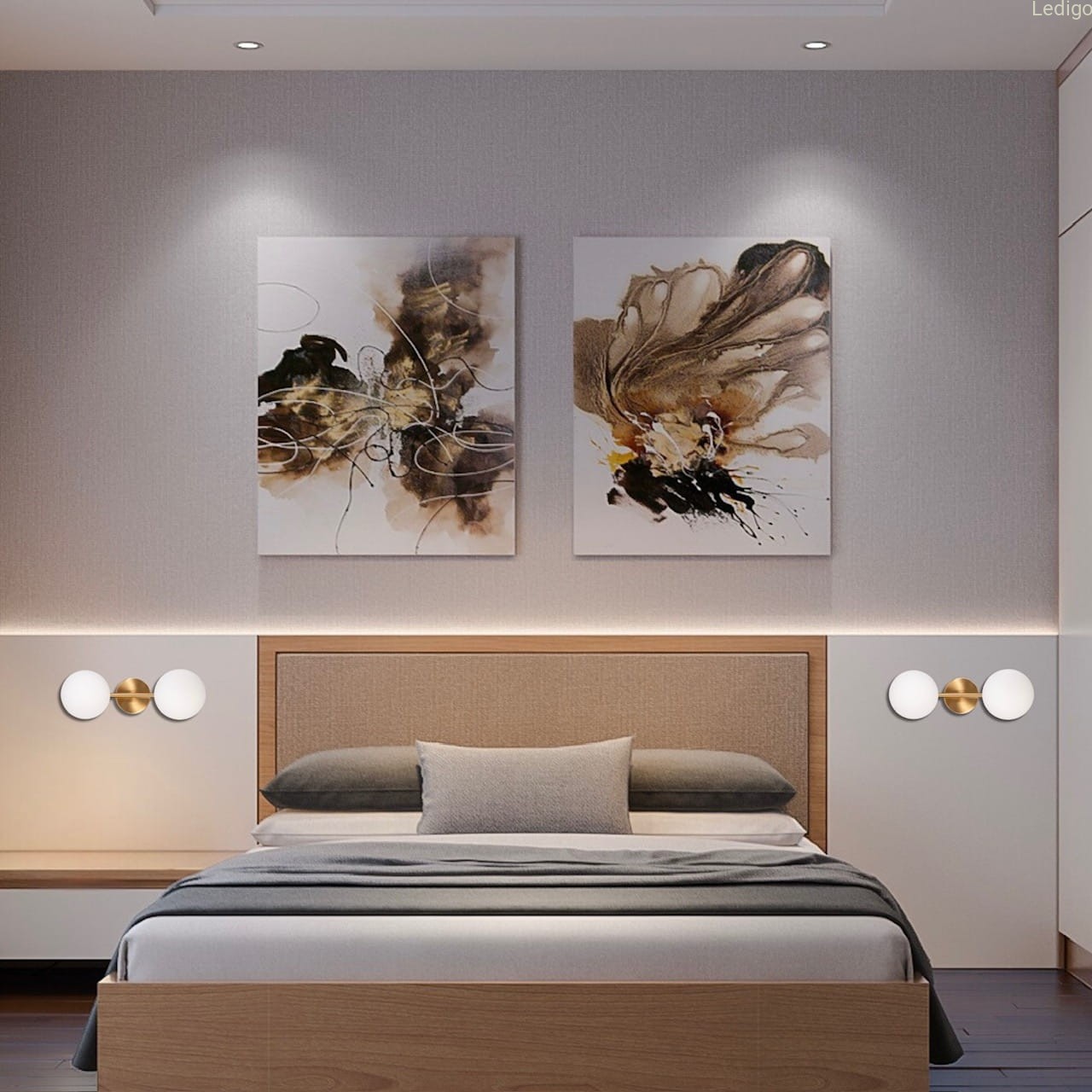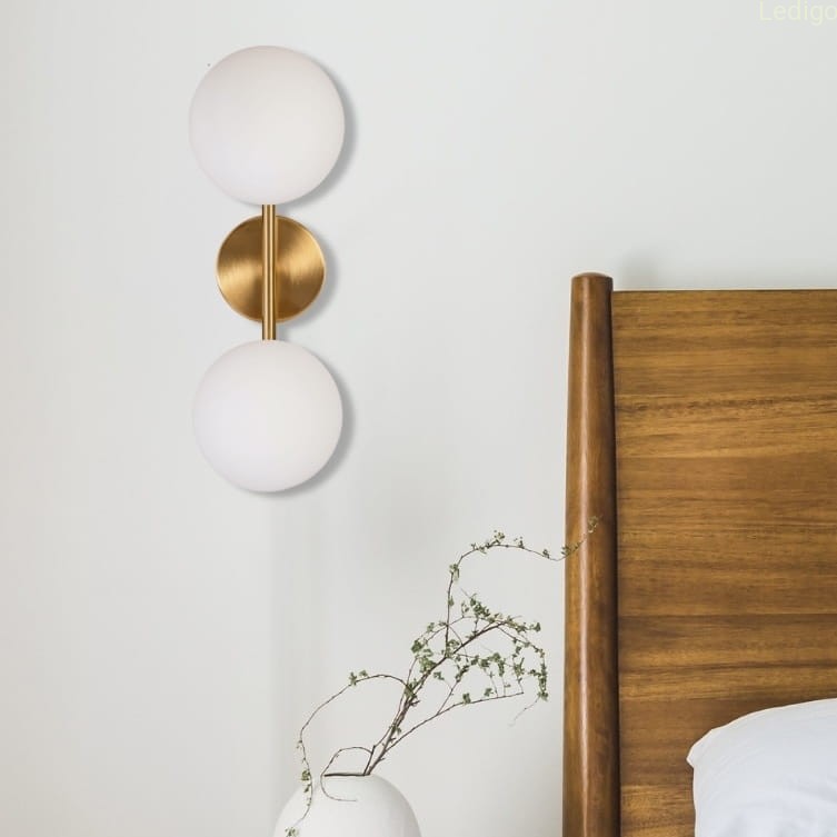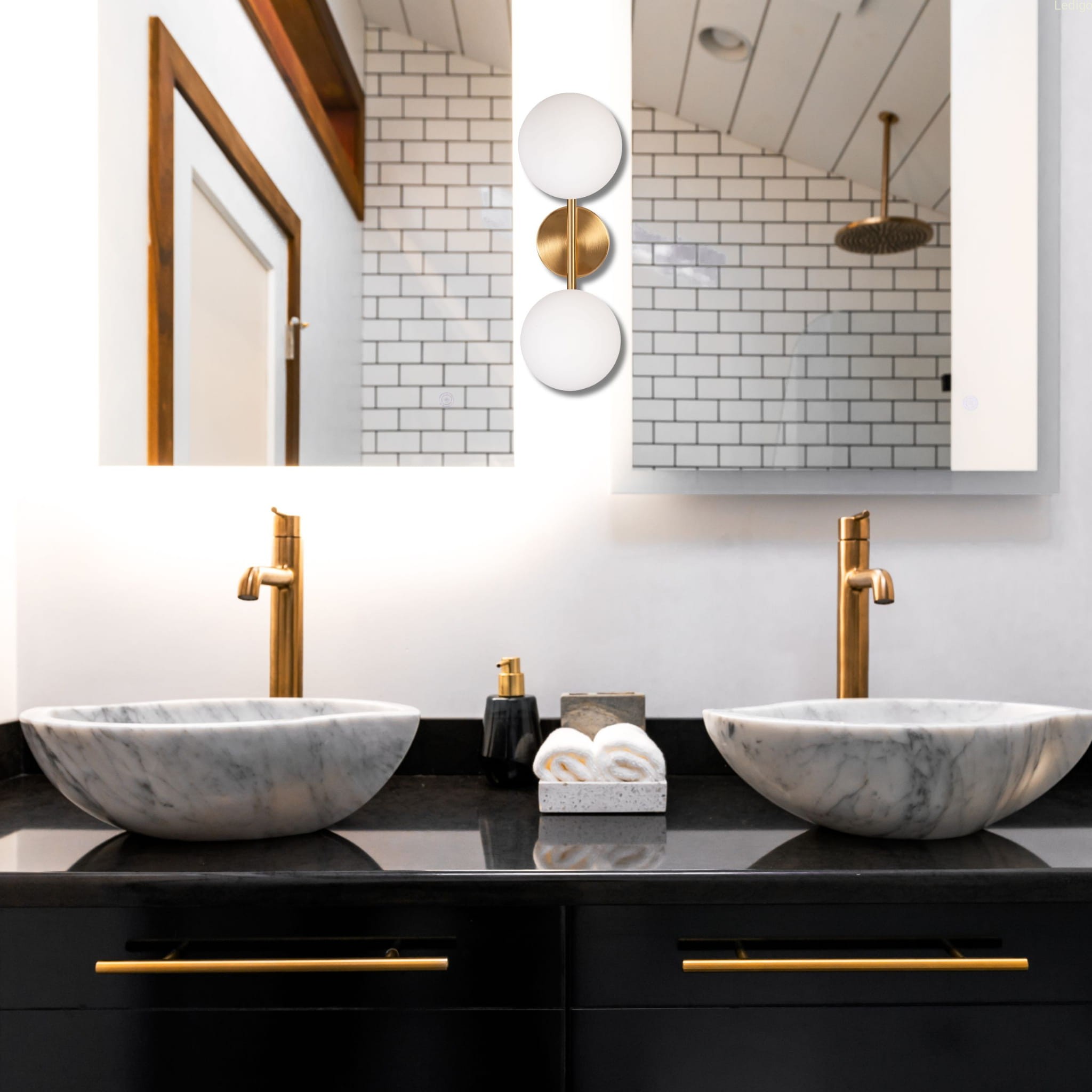 Dwa klosze z mlecznego, matowego szkła przypominają idealne perły. Dzięki swojej strukturze zamieniają surowe światło żarówek w kojącą, miękką poświatę, która nie razi w oczy, a otula pomieszczenie przytulnością.