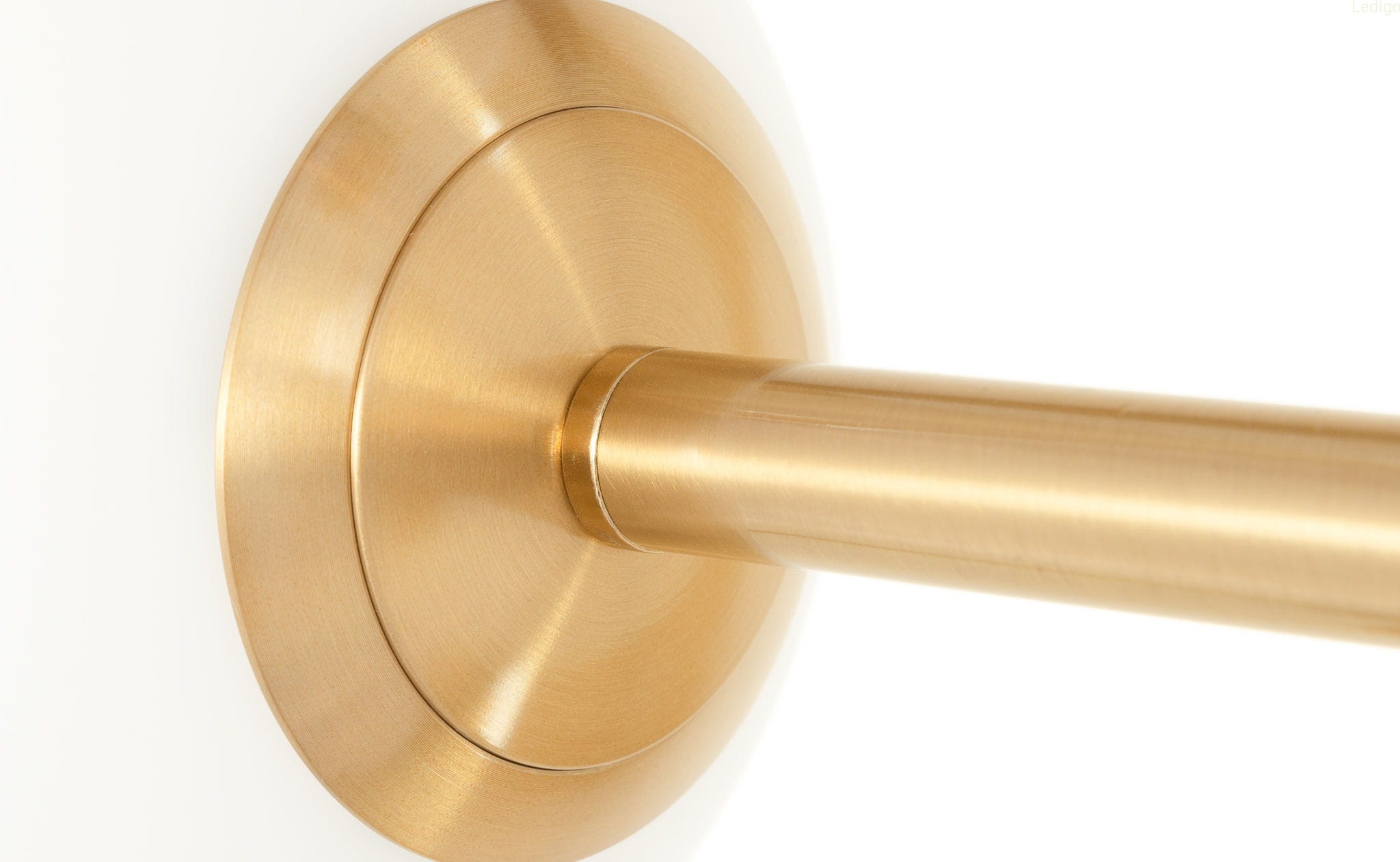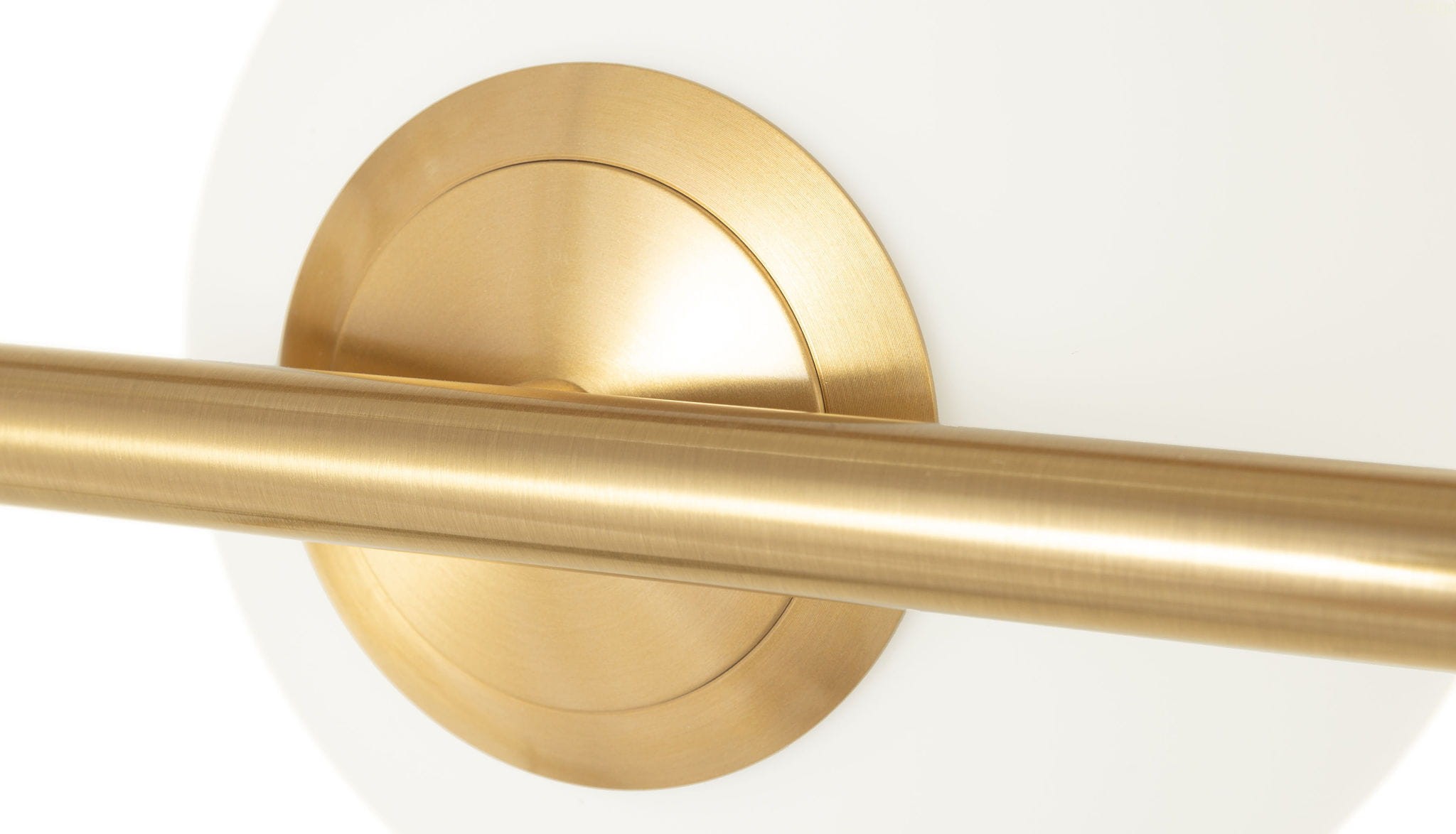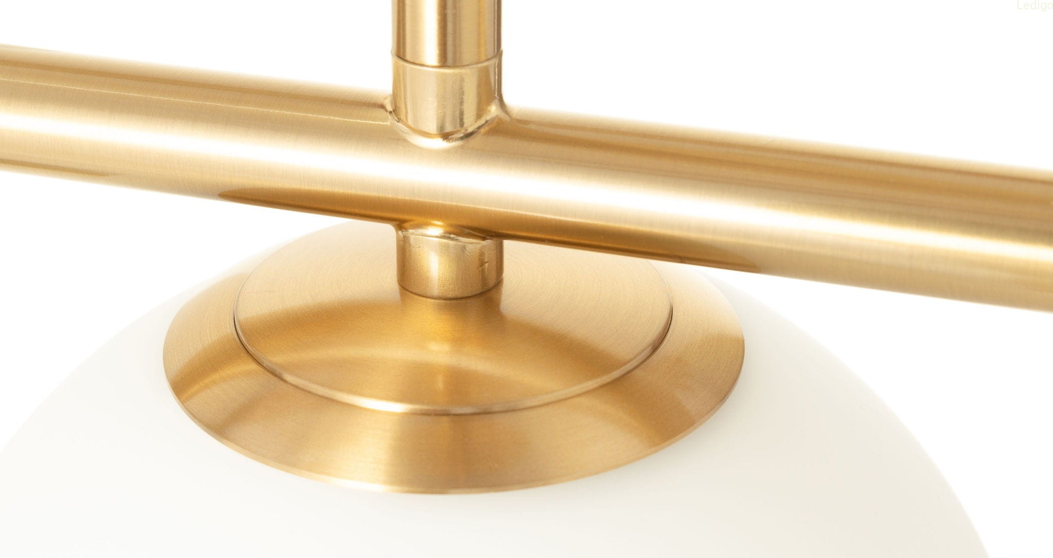 Dwa klosze z mlecznego, matowego szkła przypominają idealne perły. Dzięki swojej strukturze zamieniają surowe światło żarówek w kojącą, miękką poświatę, która nie razi w oczy, a otula pomieszczenie przytulnością.