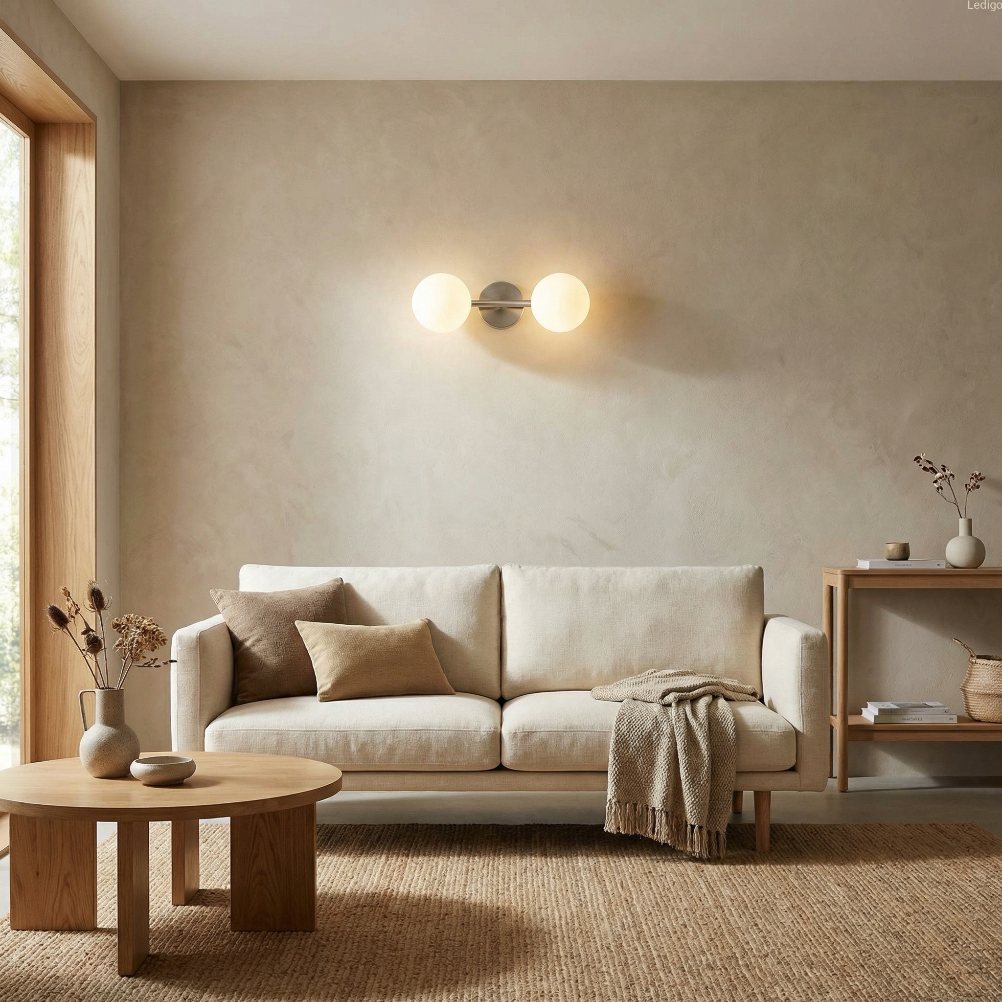Dwa klosze z mlecznego, matowego szkła przypominają idealne perły. Dzięki swojej strukturze zamieniają surowe światło żarówek w kojącą, miękką poświatę, która nie razi w oczy, a otula pomieszczenie przytulnością.