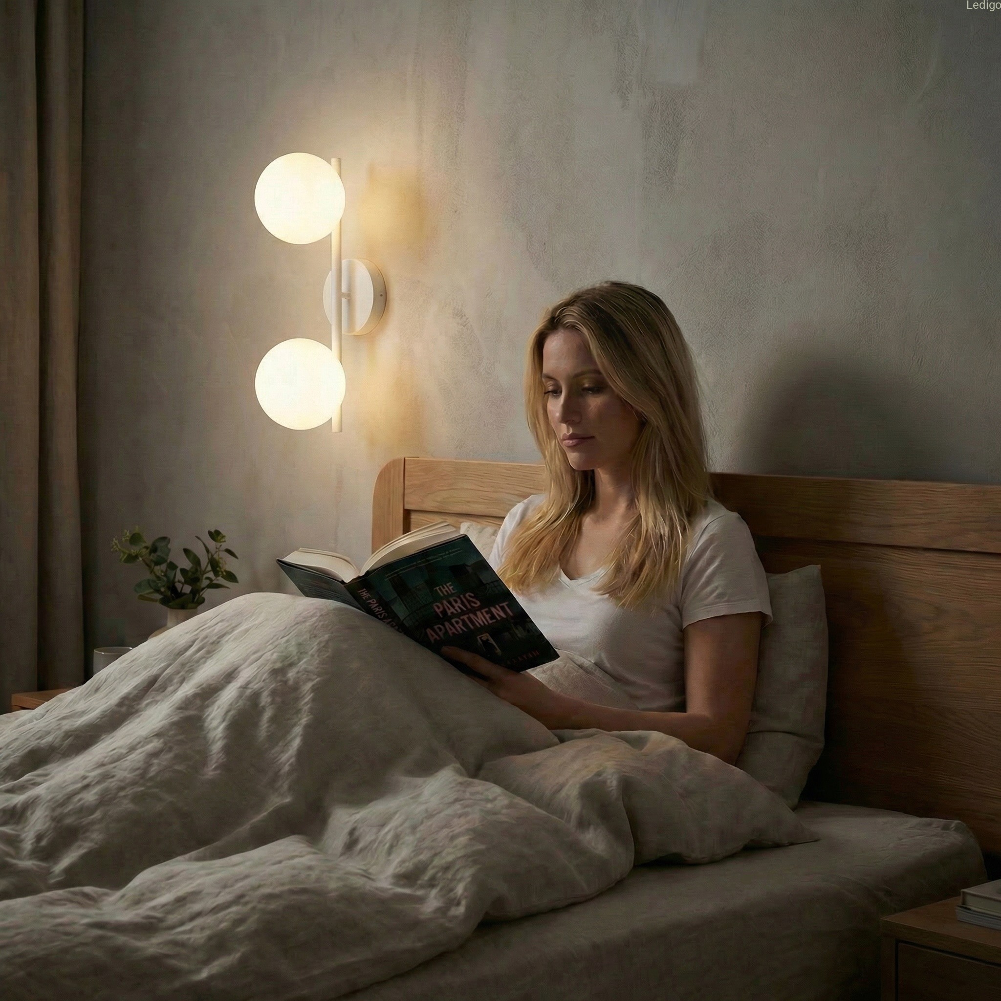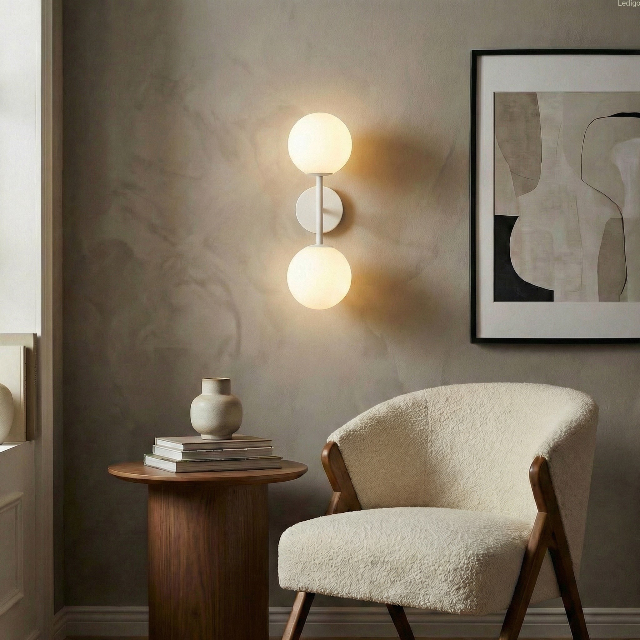 Dwa klosze z mlecznego, matowego szkła przypominają idealne perły. Dzięki swojej strukturze zamieniają surowe światło żarówek w kojącą, miękką poświatę, która nie razi w oczy, a otula pomieszczenie przytulnością.