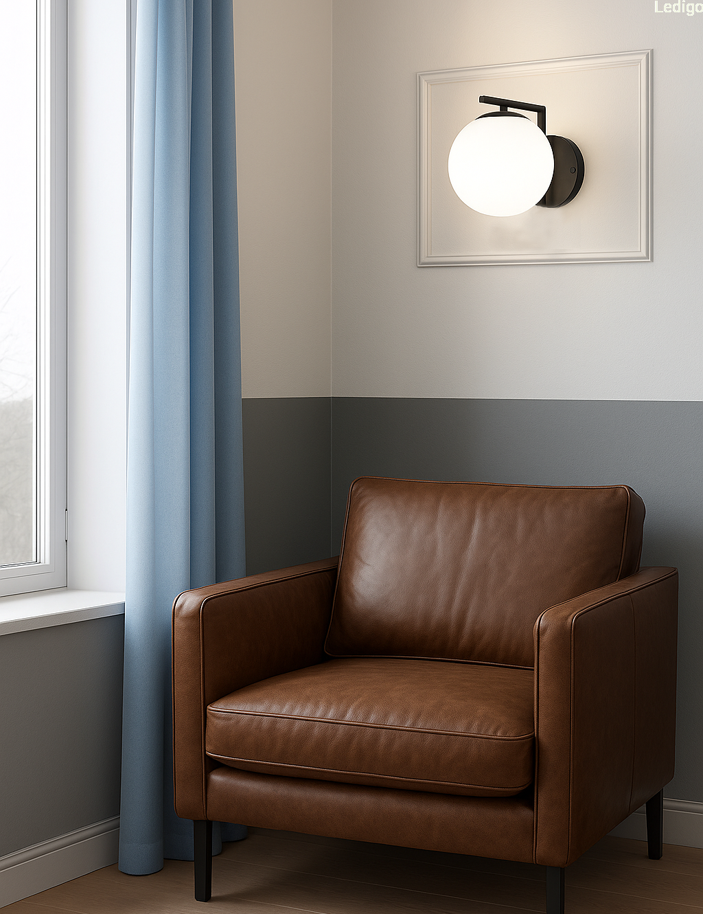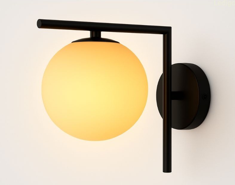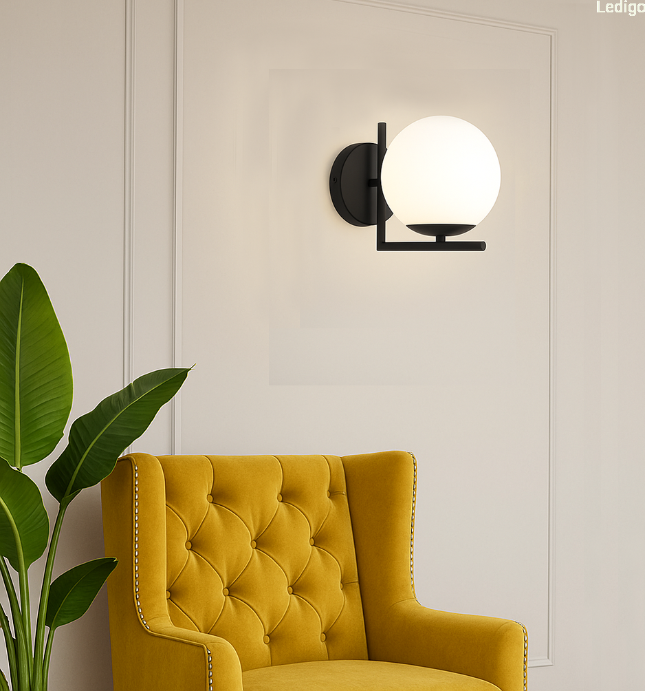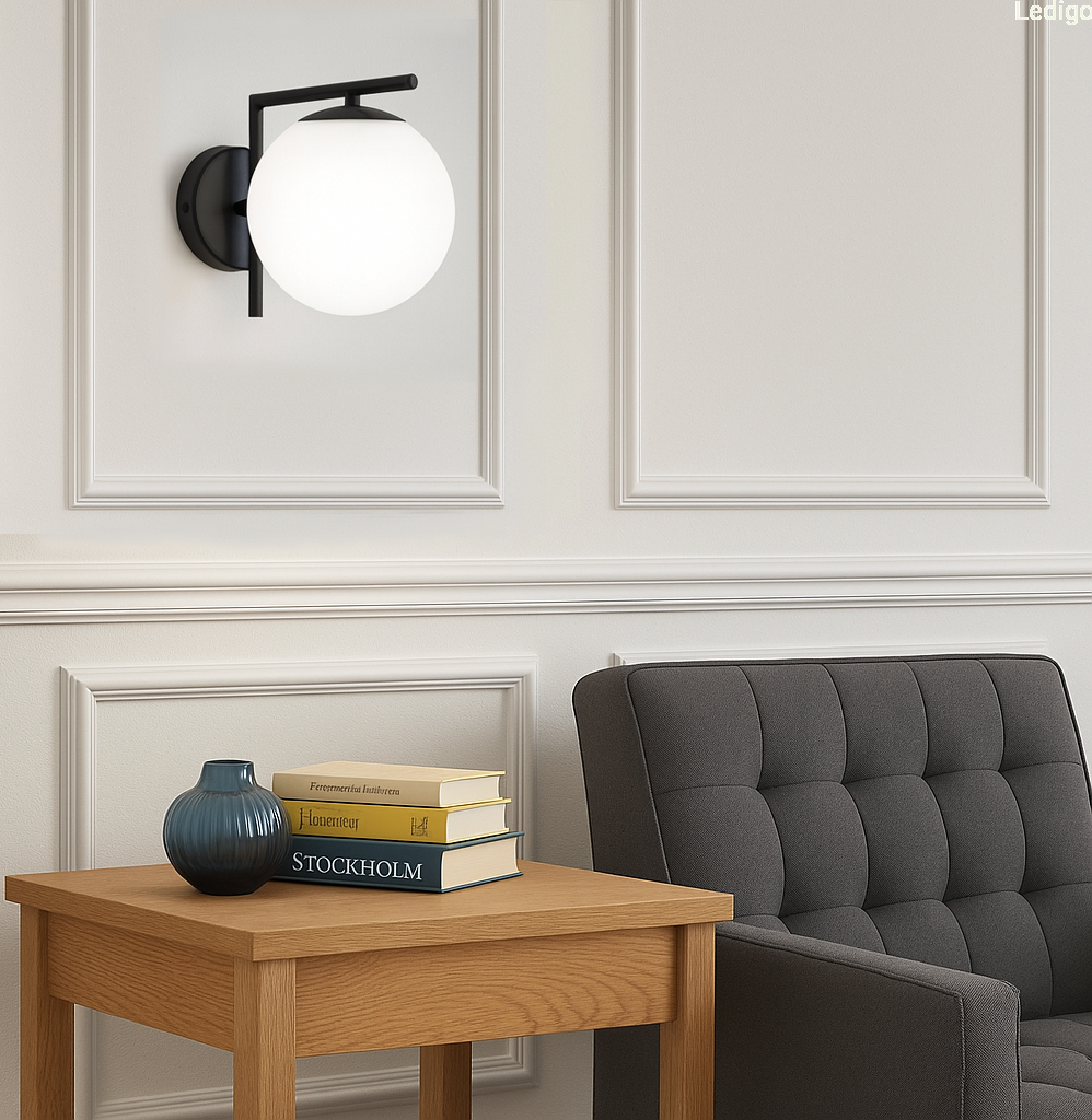 Czarny stelaż tworzy efektowny kontrast z nieskazitelną bielą szklanej kuli, co sprawia, że kinkiet prezentuje się doskonale zarówno przy włączonym, jak i wyłączonym świetle. Mleczne szkło pełni nie tylko funkcję dekoracyjną, ale przede wszystkim idealnie rozprasza światło, eliminując efekt olśnienia i wprowadzając do pomieszczenia nastrojową, ciepłą atmosferę