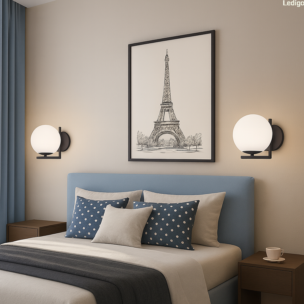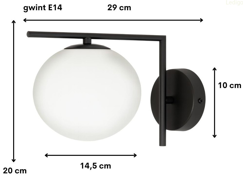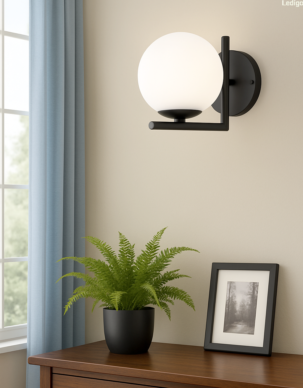 Czarny stelaż tworzy efektowny kontrast z nieskazitelną bielą szklanej kuli, co sprawia, że kinkiet prezentuje się doskonale zarówno przy włączonym, jak i wyłączonym świetle. Mleczne szkło pełni nie tylko funkcję dekoracyjną, ale przede wszystkim idealnie rozprasza światło, eliminując efekt olśnienia i wprowadzając do pomieszczenia nastrojową, ciepłą atmosferę