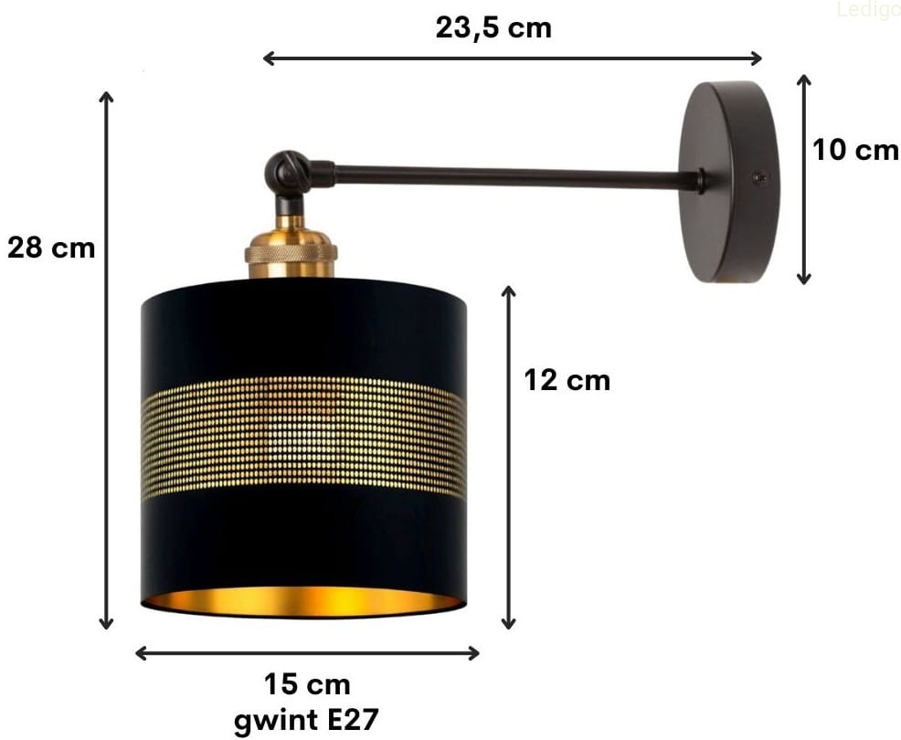 Rodzaj lampy: kinkiet Dwuobwodowość: nie Rodzaj gwintu: E27 Styl: loft Tworzywo: metal + tkanina Kolor klosza: czarny Kolor uchwytu: Antyczne złoto Wysokość całkowita: 28cm Szerokość całkowita: 15cm Głebokość całkowita: 23,5cm Szerokość klosza: 15cm Wysokość klosza: 12cm Średnica maskownicy: 10cm Możliwość ściemniania: w zależności od żarówki Stopień ochrony IP: IP20 Regulacja wysokości: tak Napięcie: 230V Źródło światła w zestawie: nie Czas realizacji: 24h