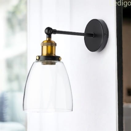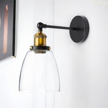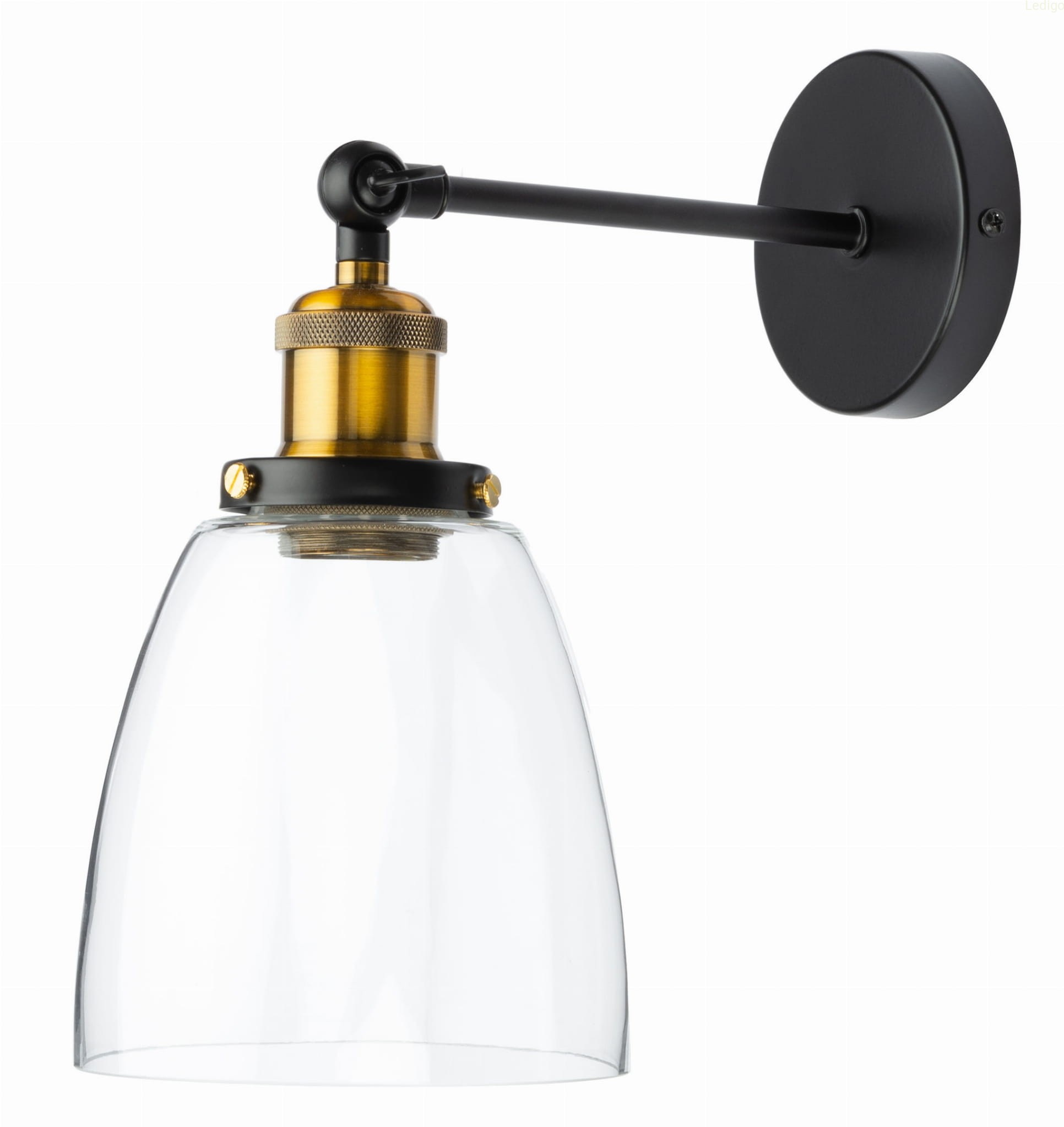 Prezentujemy kinkiet wykonany jest z metalu w kolorze matowej czerni. Oprawa w złotym kolorze sprawia że kinkiet znakomicie prezentuje się również w nowoczesnych wnętrzach. Dodatkowym atutem kinkietu jest możliwość ustawienia klosza pod różnym kątem. Regulacja motylkowa (góra dół) Kinkiet świetnie prezentuje się na tle betonu i surowej cegły może być również odważnym akcentem w rustykalnych wnętrzach. Jest znakomitym dopełnieniem wnętrz o industrialnym i loftowym charakterze. Wpisuje się również w nowoczesne aranżacje.