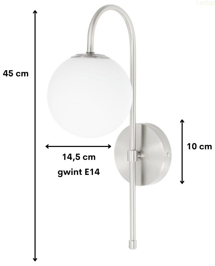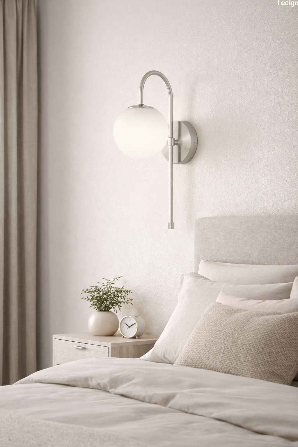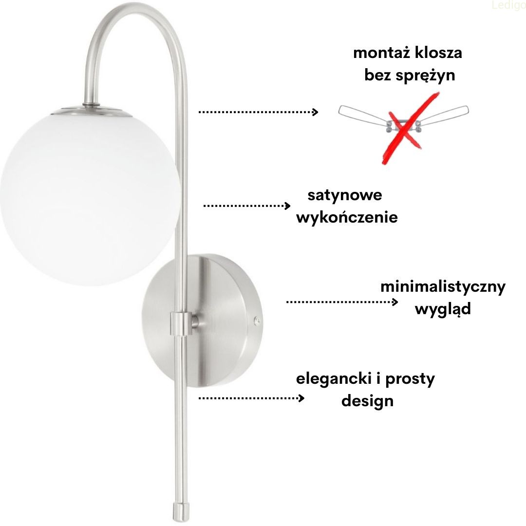 Srebrny stelaż tworzy efektowny kontrast z nieskazitelną bielą szklanej kuli, co sprawia, że kinkiet prezentuje się doskonale zarówno przy włączonym, jak i wyłączonym świetle. Mleczne szkło pełni nie tylko funkcję dekoracyjną, ale przede wszystkim idealnie rozprasza światło, eliminując efekt olśnienia i wprowadzając do pomieszczenia nastrojową, ciepłą atmosferę