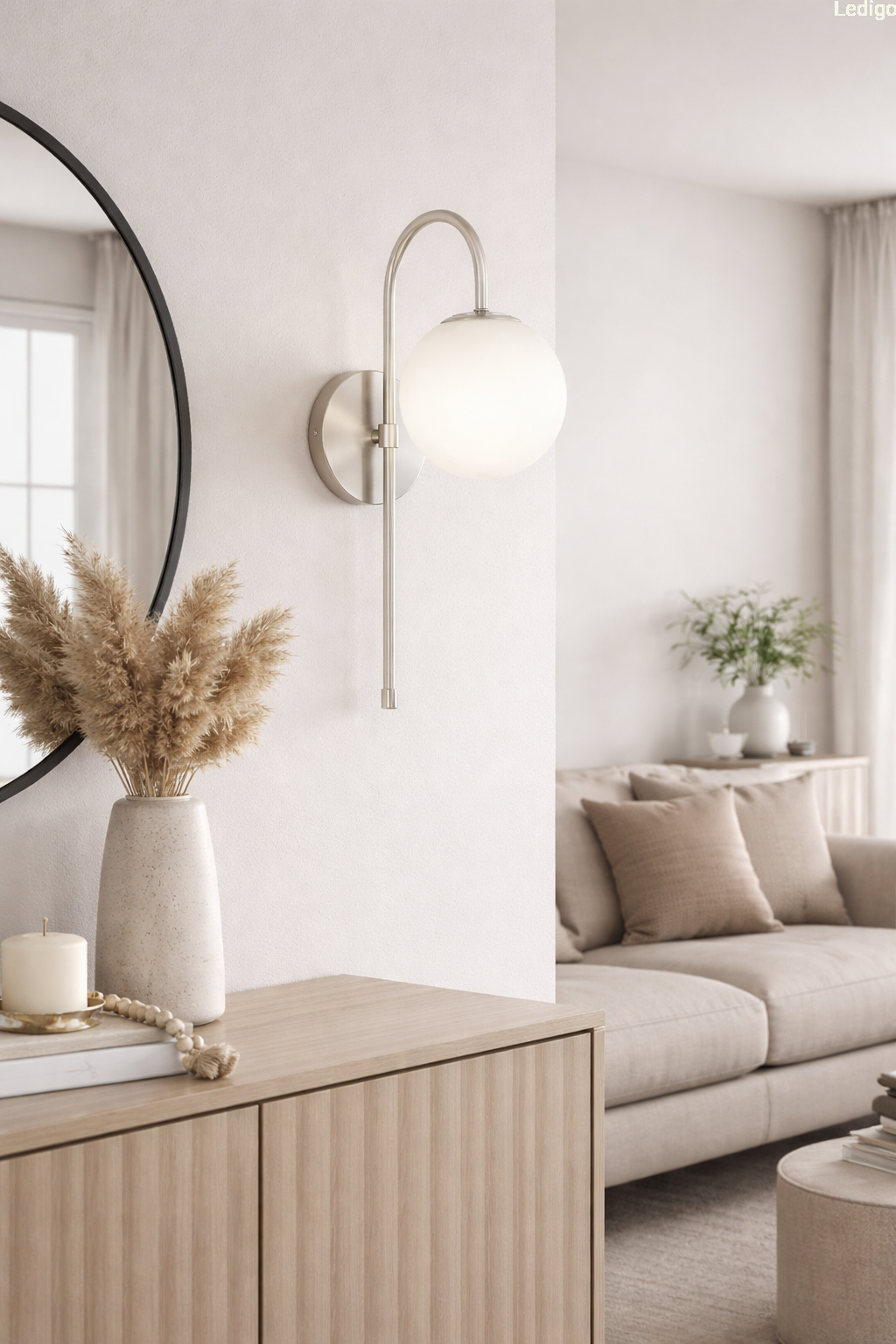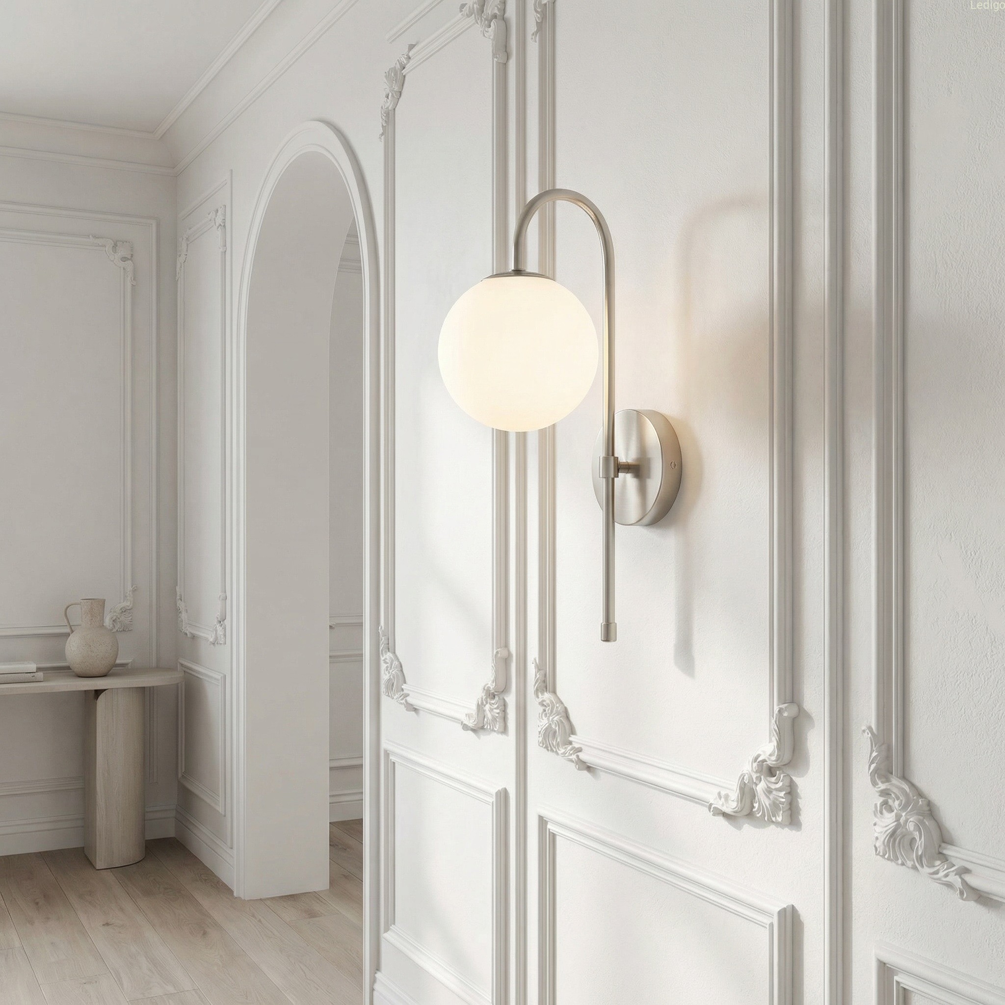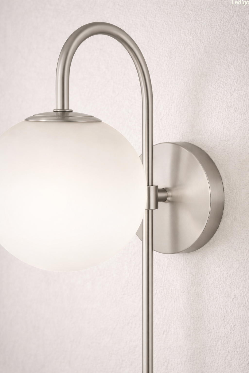 Srebrny stelaż tworzy efektowny kontrast z nieskazitelną bielą szklanej kuli, co sprawia, że kinkiet prezentuje się doskonale zarówno przy włączonym, jak i wyłączonym świetle. Mleczne szkło pełni nie tylko funkcję dekoracyjną, ale przede wszystkim idealnie rozprasza światło, eliminując efekt olśnienia i wprowadzając do pomieszczenia nastrojową, ciepłą atmosferę