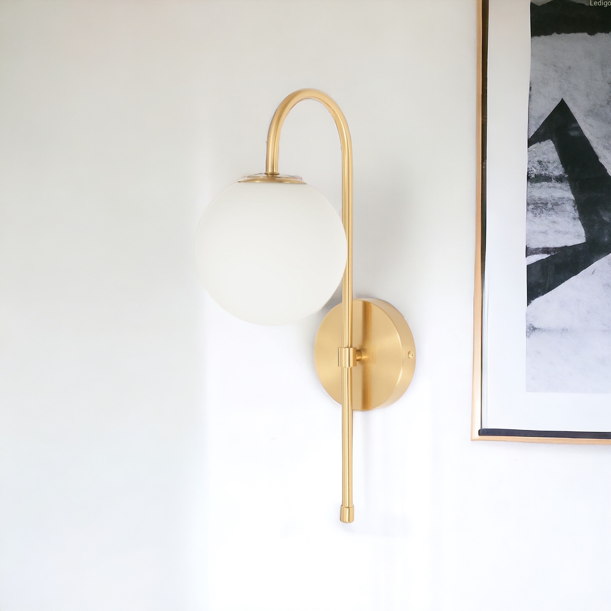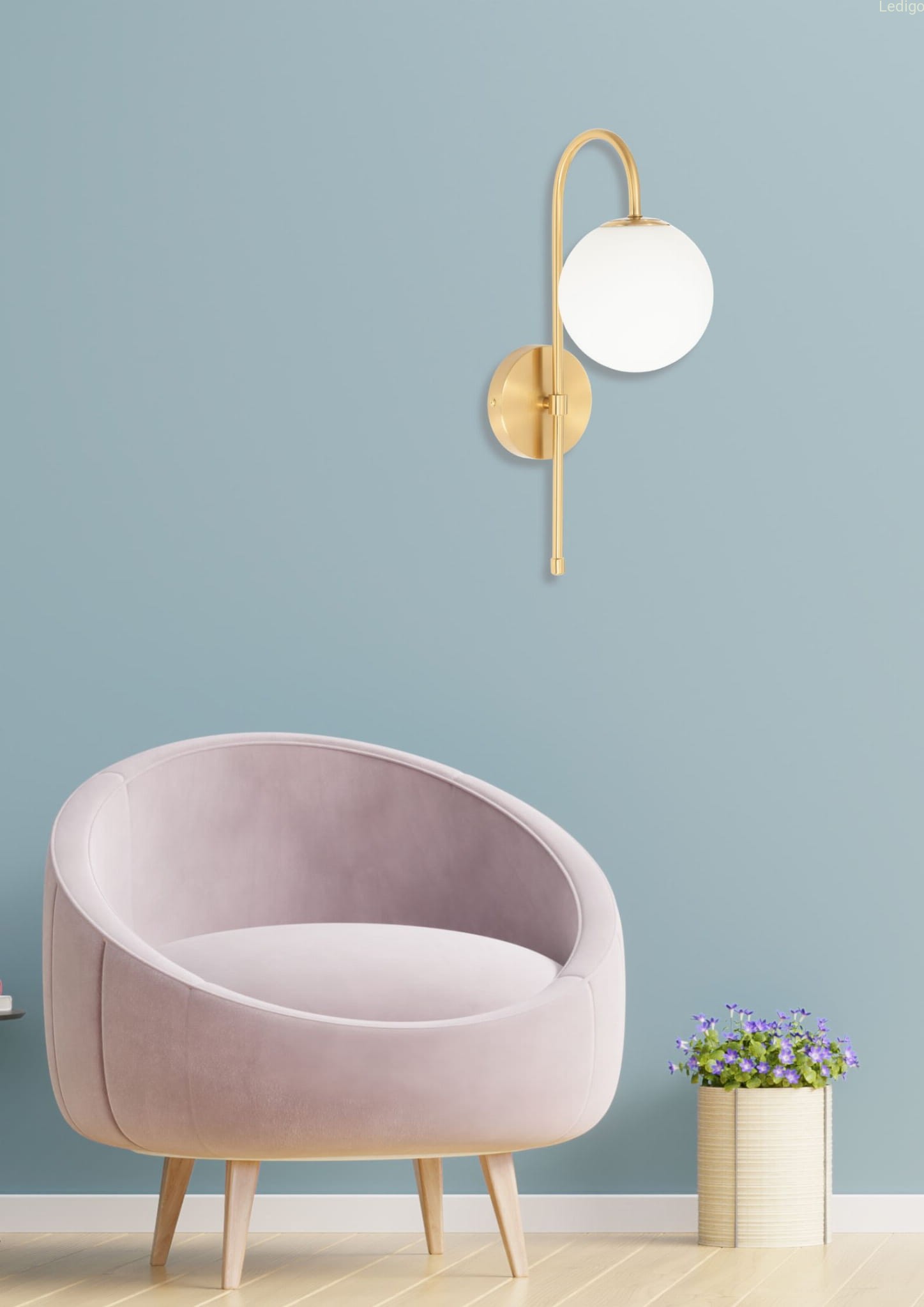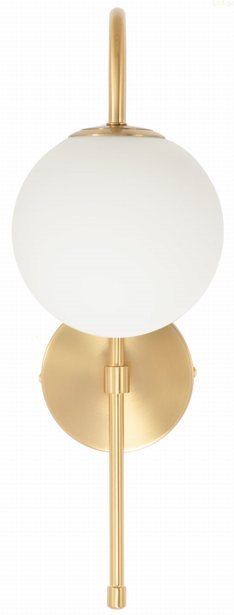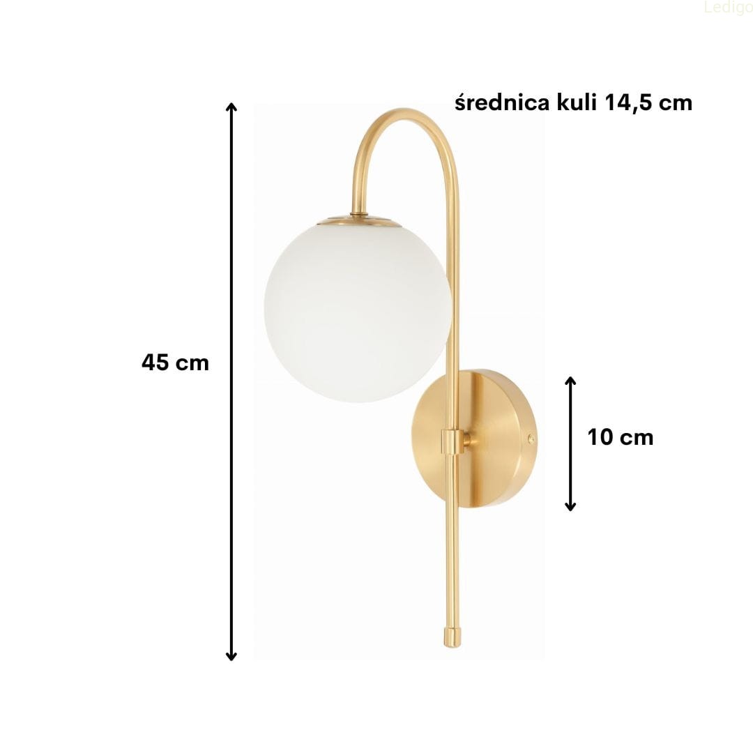 Złoty stelaż tworzy efektowny kontrast z nieskazitelną bielą szklanej kuli, co sprawia, że kinkiet prezentuje się doskonale zarówno przy włączonym, jak i wyłączonym świetle. Mleczne szkło pełni nie tylko funkcję dekoracyjną, ale przede wszystkim idealnie rozprasza światło, eliminując efekt olśnienia i wprowadzając do pomieszczenia nastrojową, ciepłą atmosferę