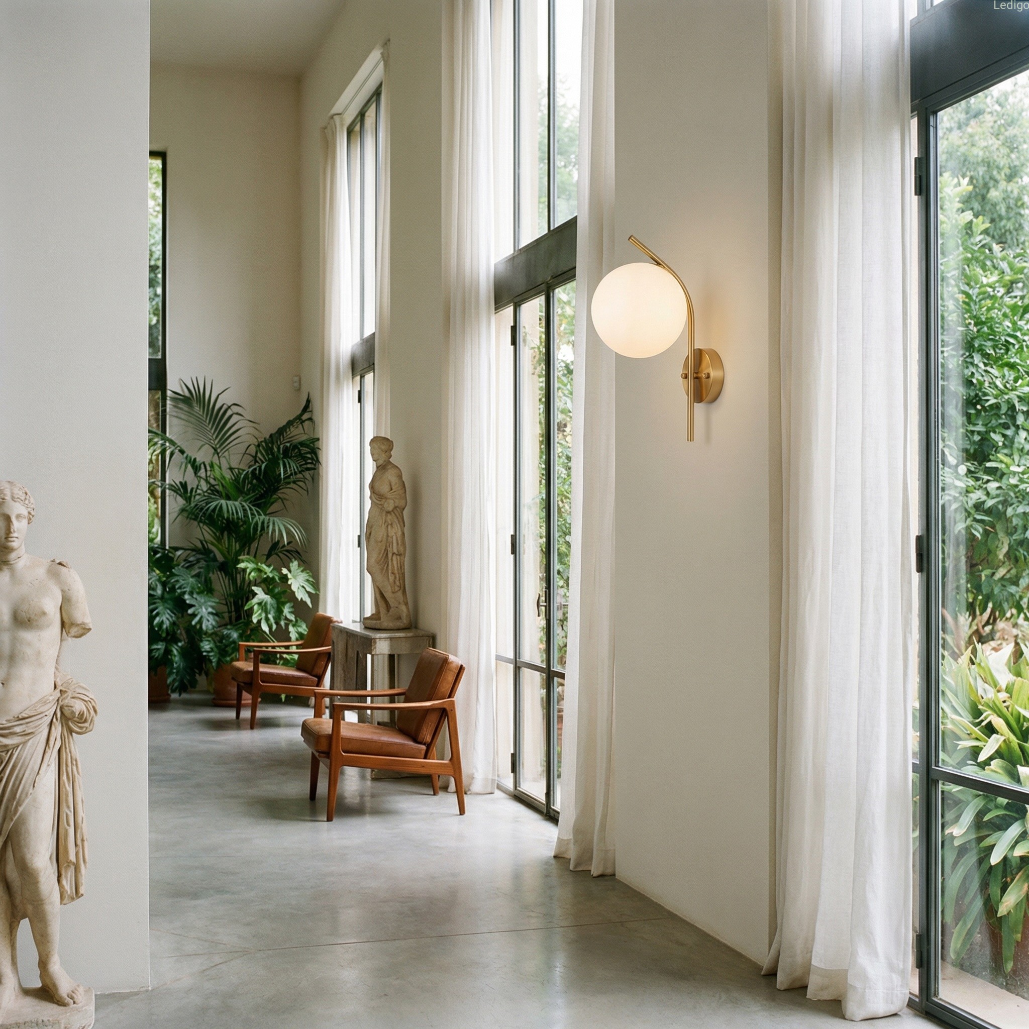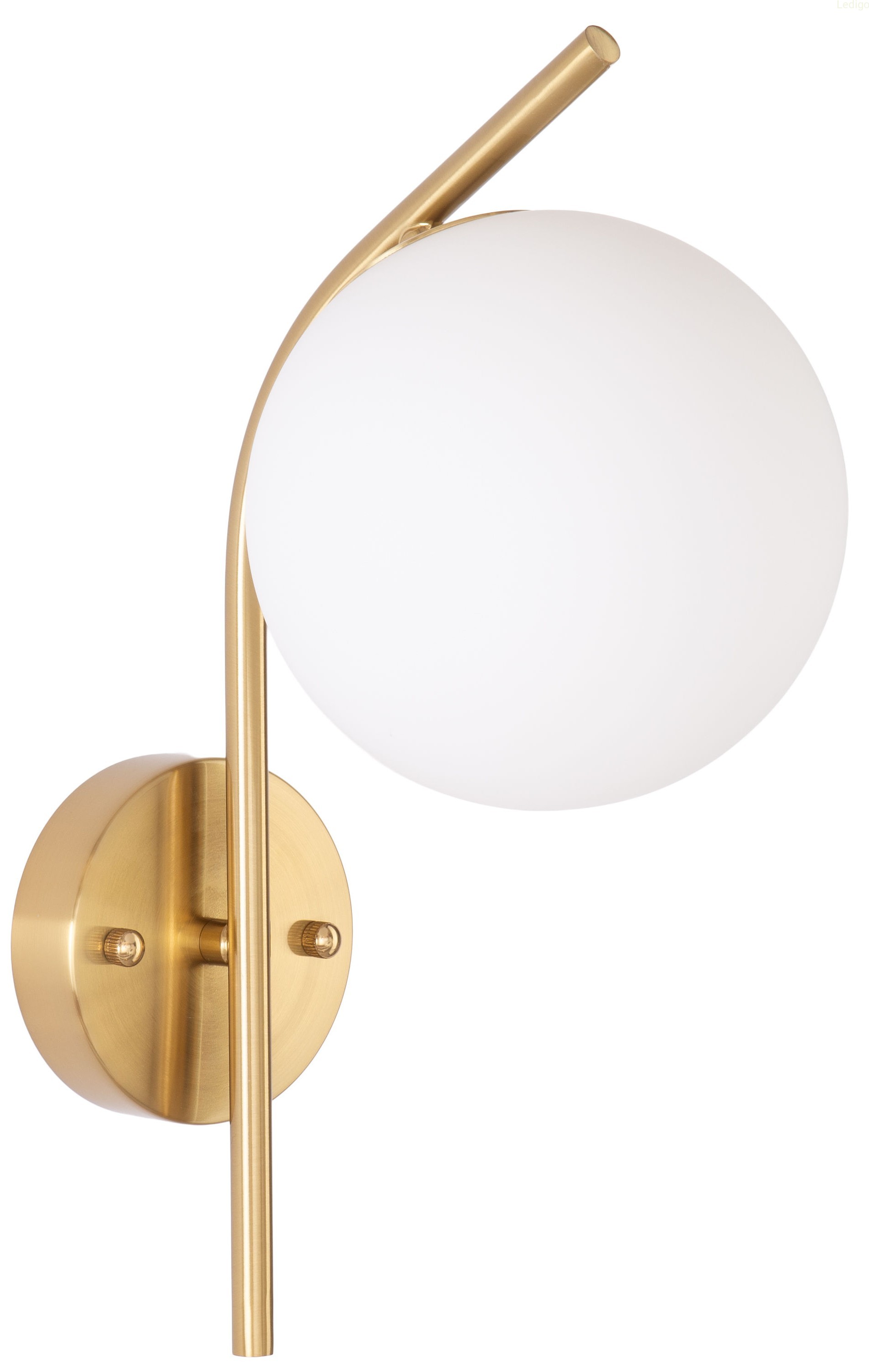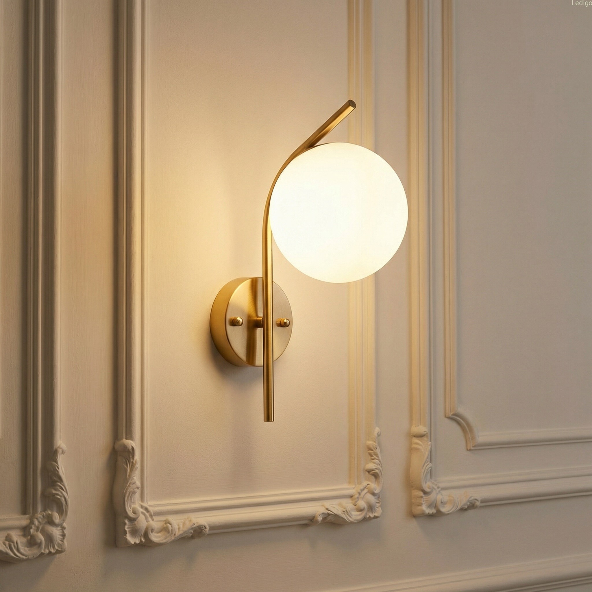 Złoty stelaż tworzy efektowny kontrast z nieskazitelną bielą szklanej kuli, co sprawia, że kinkiet prezentuje się doskonale zarówno przy włączonym, jak i wyłączonym świetle. Mleczne szkło pełni nie tylko funkcję dekoracyjną, ale przede wszystkim idealnie rozprasza światło, eliminując efekt olśnienia i wprowadzając do pomieszczenia nastrojową, ciepłą atmosferę