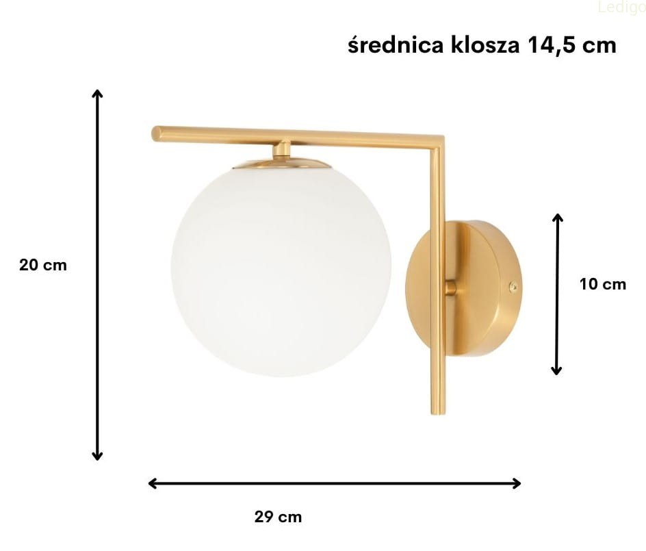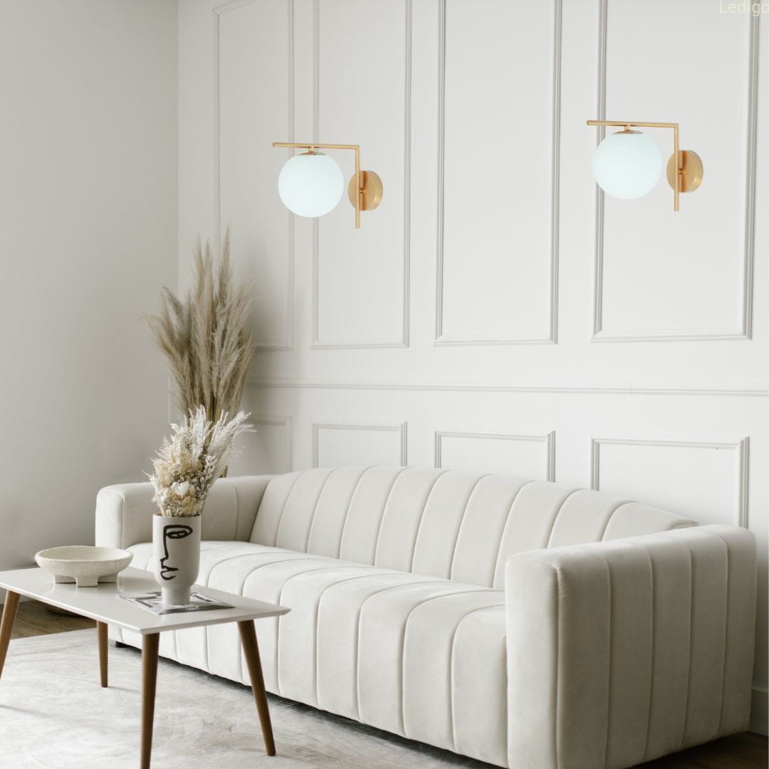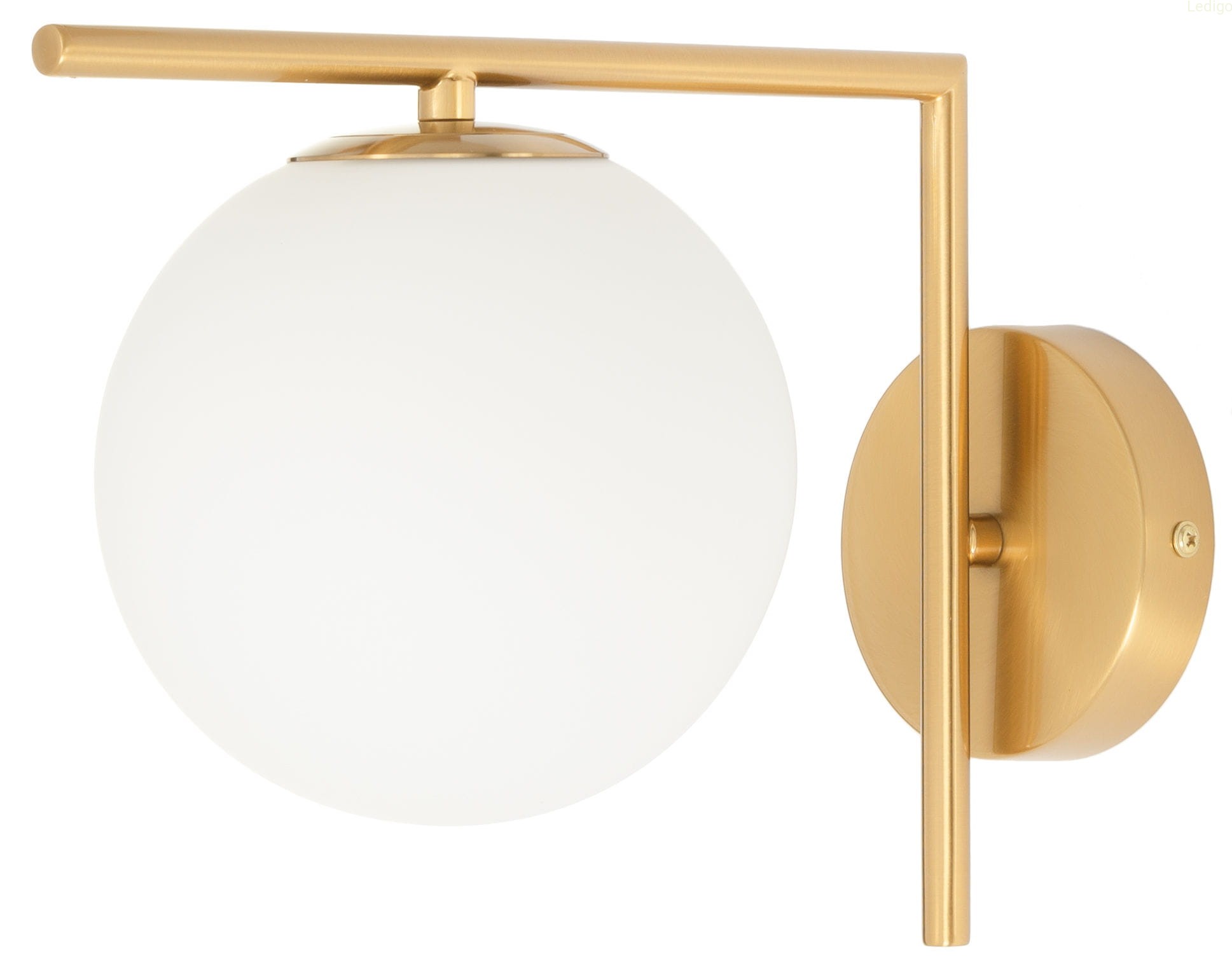 Złoty stelaż tworzy efektowny kontrast z nieskazitelną bielą szklanej kuli, co sprawia, że kinkiet prezentuje się doskonale zarówno przy włączonym, jak i wyłączonym świetle. Mleczne szkło pełni nie tylko funkcję dekoracyjną, ale przede wszystkim idealnie rozprasza światło, eliminując efekt olśnienia i wprowadzając do pomieszczenia nastrojową, ciepłą atmosferę