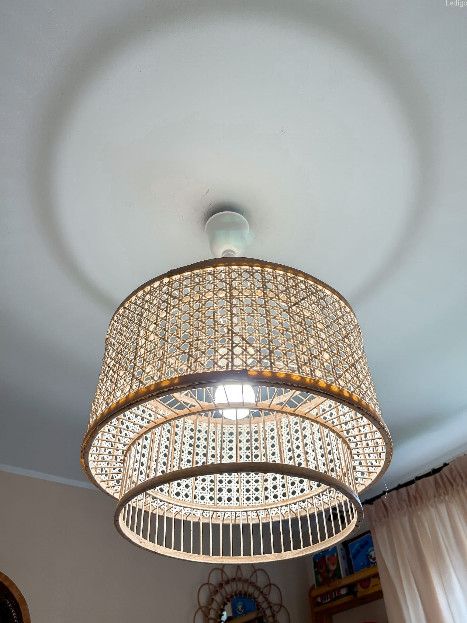 Klosz został ręcznie wykonany z drewna bambusowego. Trzy części klosza są zintegrowane tworząc piękną lampę w całości. Dzięki swoim rozmiarom lampa znakomicie sprawdzi się jako główne oświetlenie salonu, kuchni czy sypialni. Plecionka pozwala przenikać światłu dzięki czemu lampa tworzy piękny klimat w pomieszczeniu.