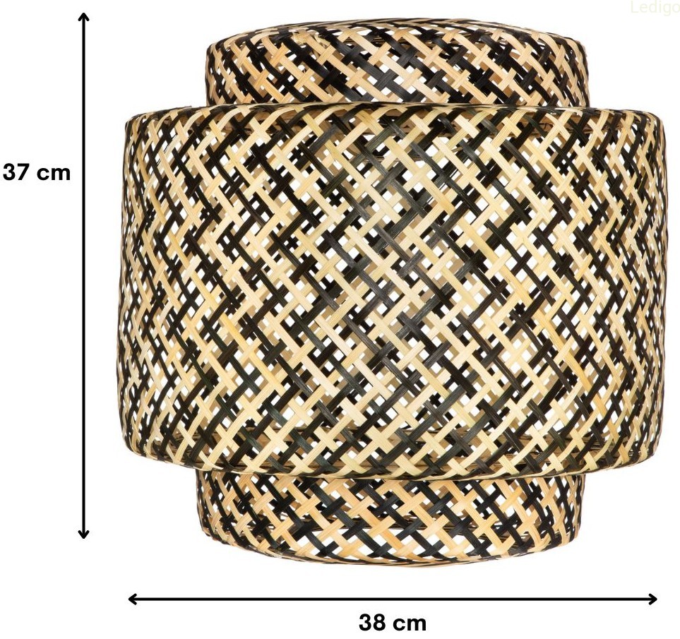Typ: klosz Tworzywo: bambus Kolor obudowy: beżowo czarny Wymiary: Wysokość 37cm, średnica 38m Waga produktu: 0,200 kg Wzór: nie Gwint: E27