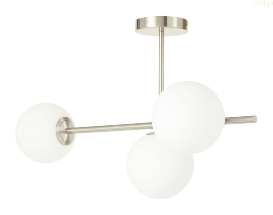 Lampa posiada poziomą konstrukcję w kolorze srebrnym (szczotkowanym), na której końcach osadzone są trzy klosze.
