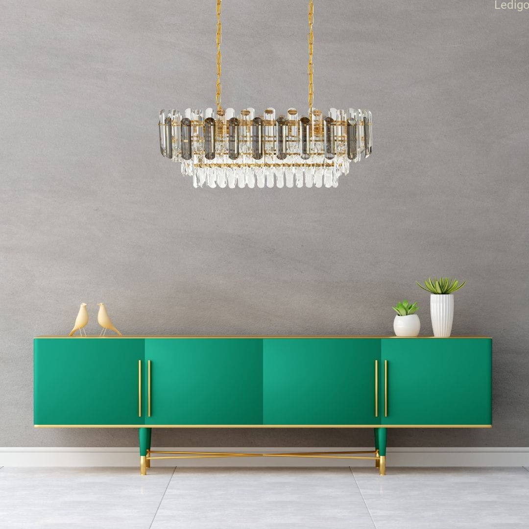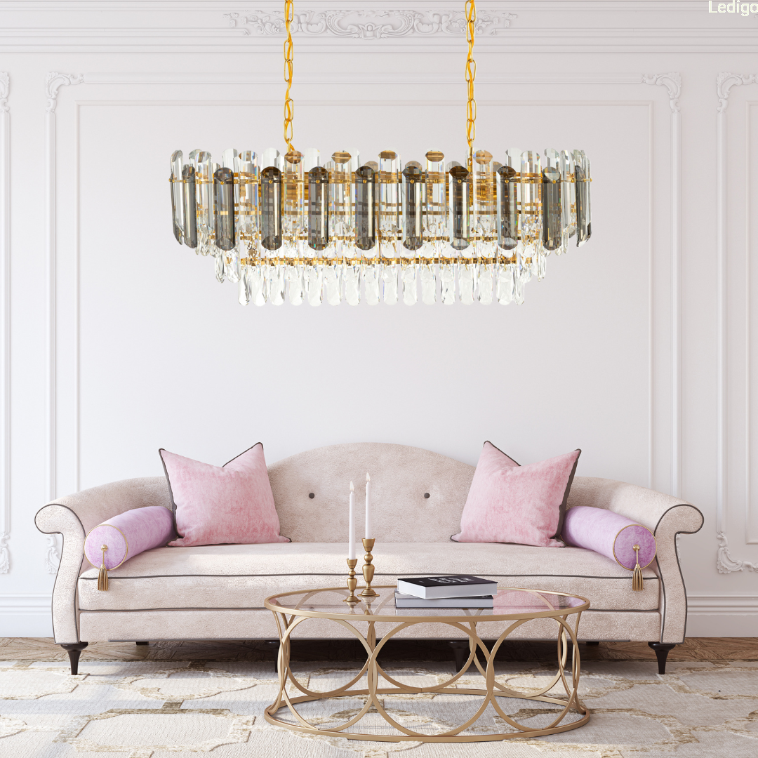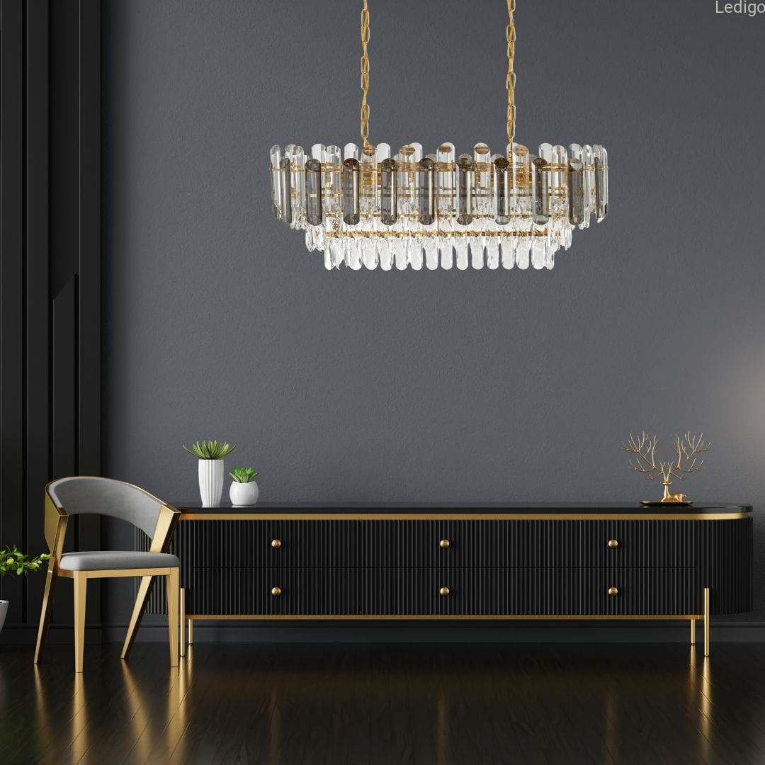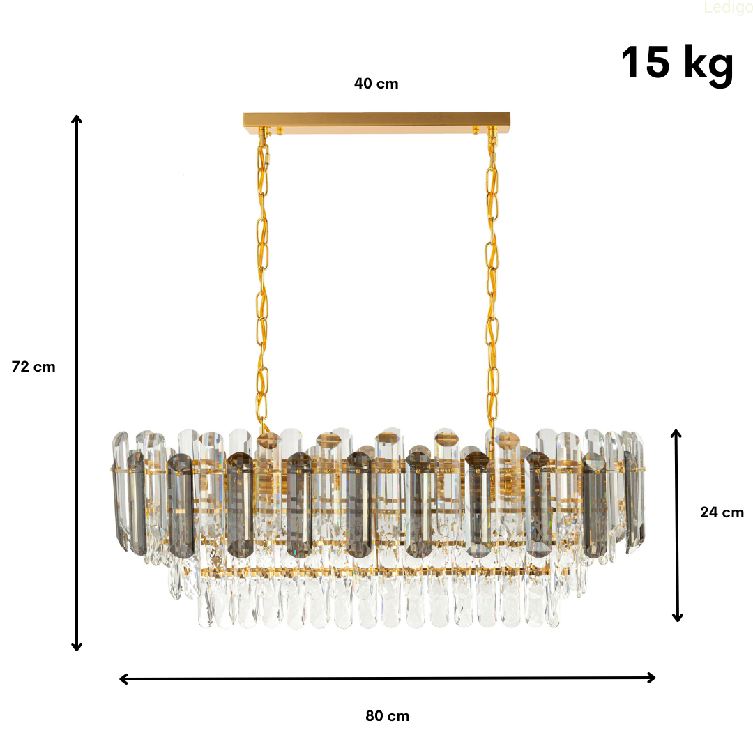 PODŁUŻNY KRYSZTAŁOWY ZWIESZANY ŻYRANDOL Z KOLEKCJI LUXURY GOLD GREY LEDIGO