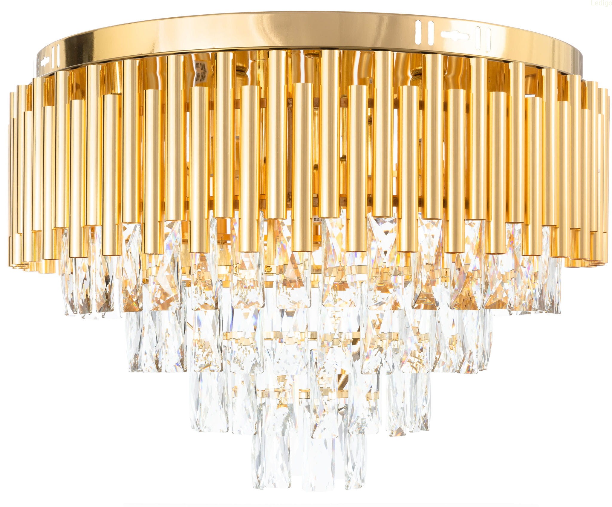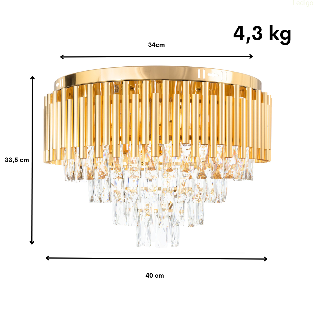 Lampa w kolorze złota mocowana jest bezpośrednio do sufitu. Dziesiątki szklanych kryształów tworzą efektowny design. Wysoka klasa kryształów (K5) pozwala jeszcze piękniej przenikać światłu i doświetlać nawet duży salon.