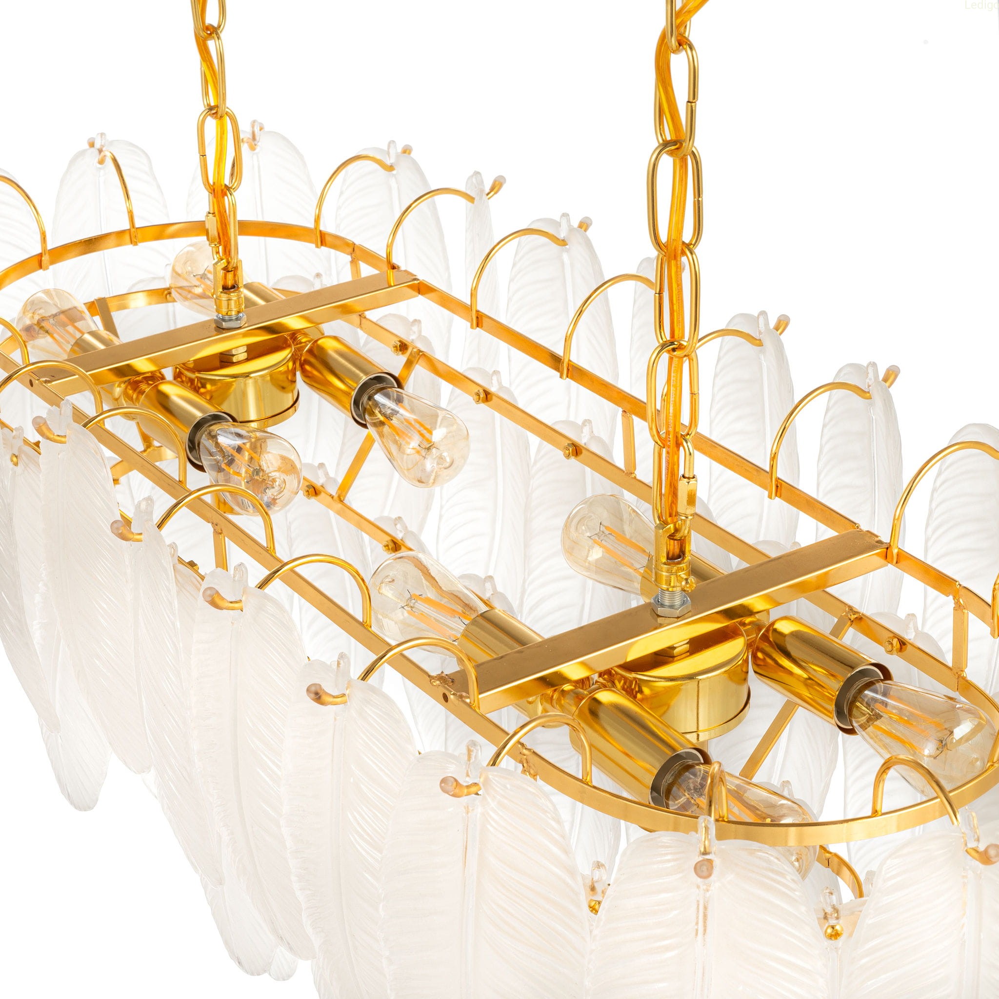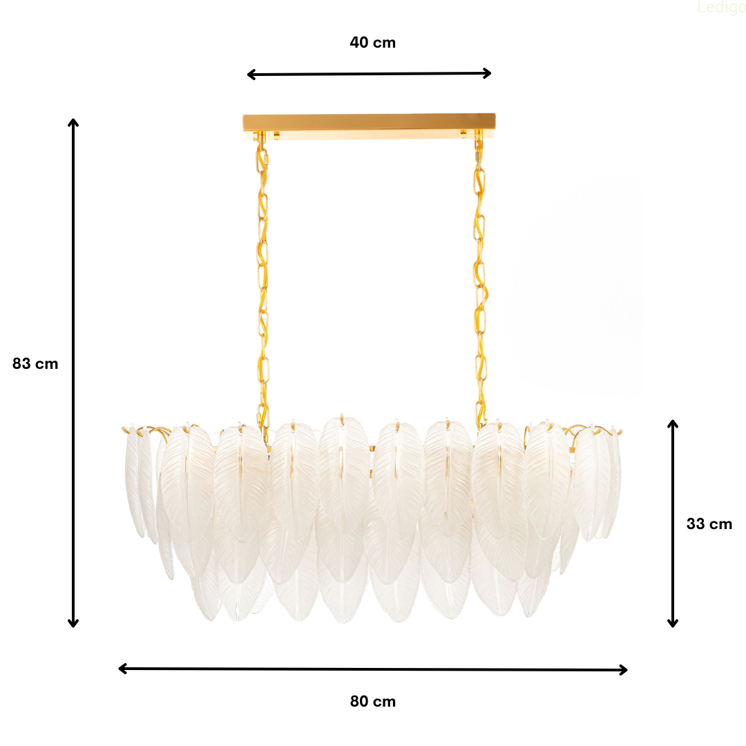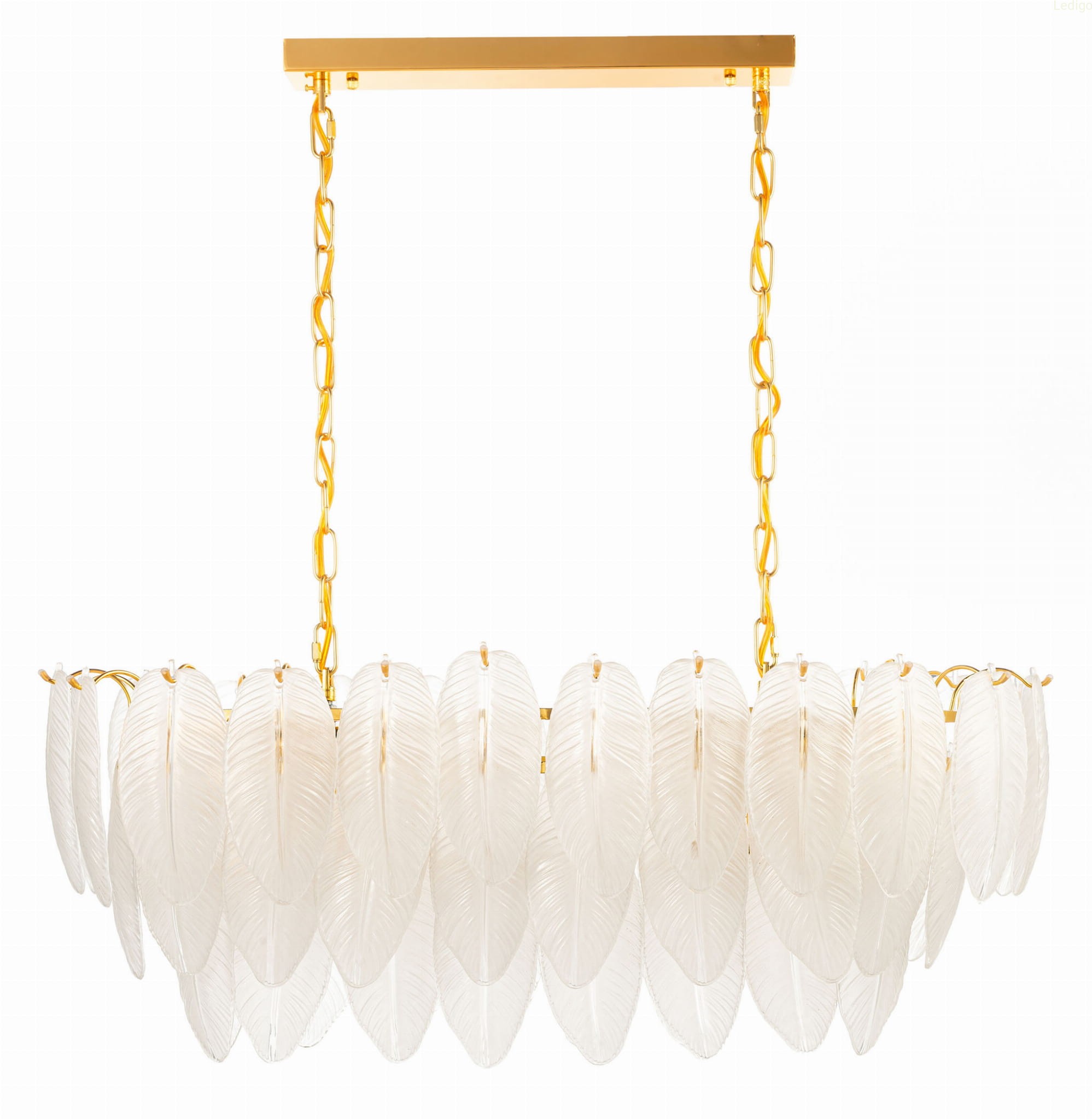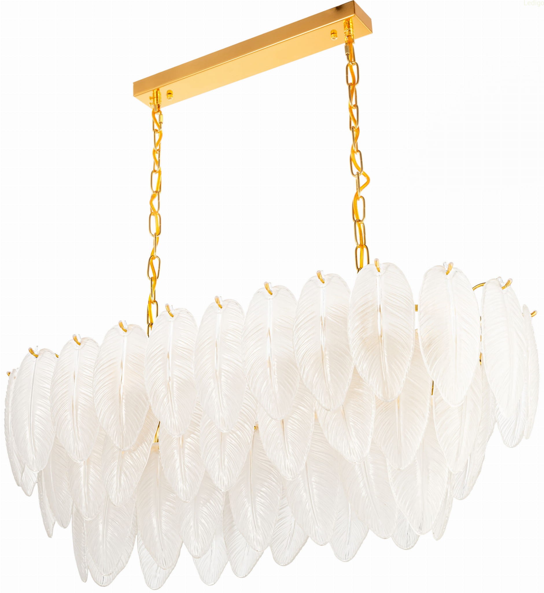 Luksusowa lampa sufitowa w podłużnym kształcie składająca się z kaskad szklanych mlecznych listków, które tworzą we wnętrzu niezwykle fascynujący efekt wizualny.