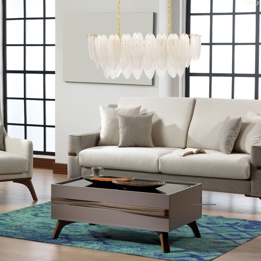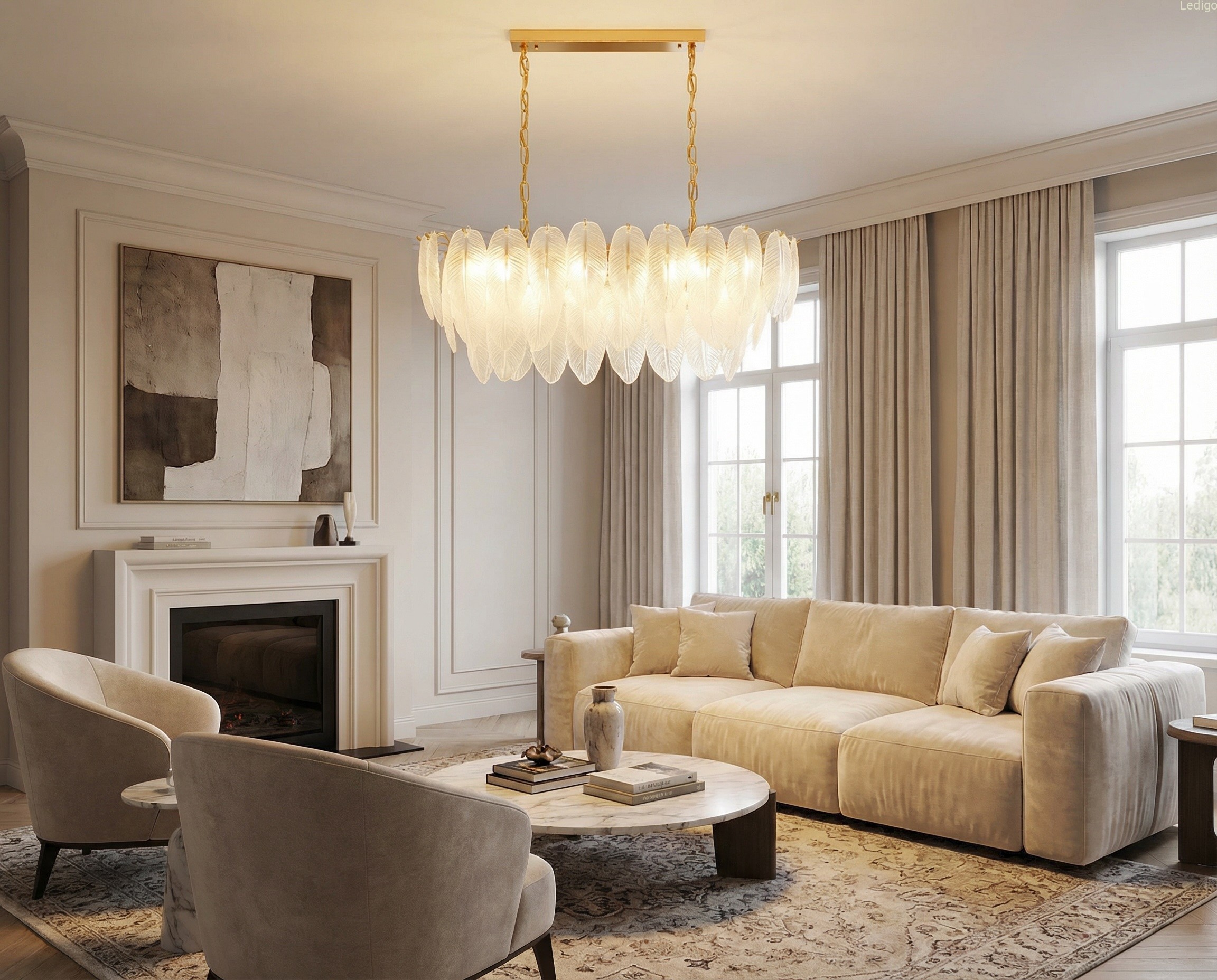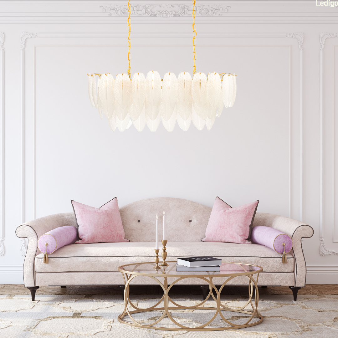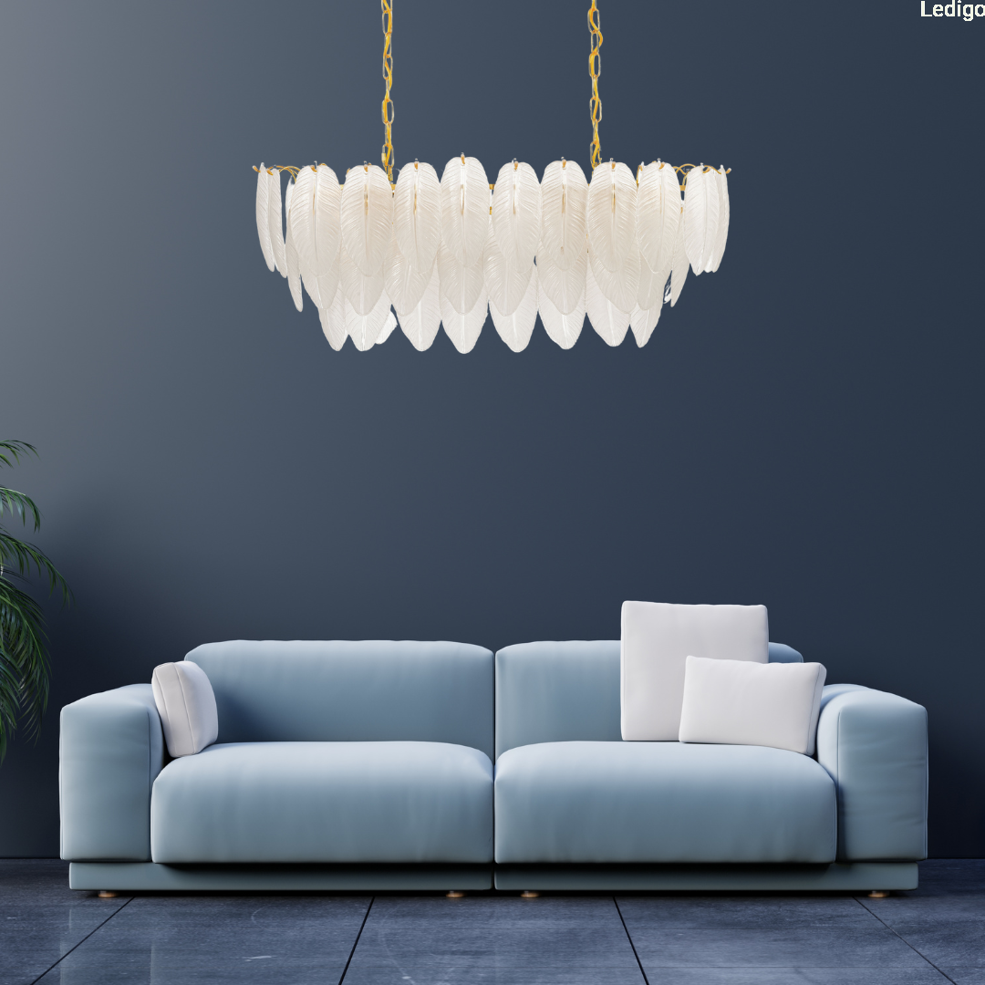 Luksusowa lampa sufitowa w podłużnym kształcie składająca się z kaskad szklanych mlecznych listków, które tworzą we wnętrzu niezwykle fascynujący efekt wizualny.