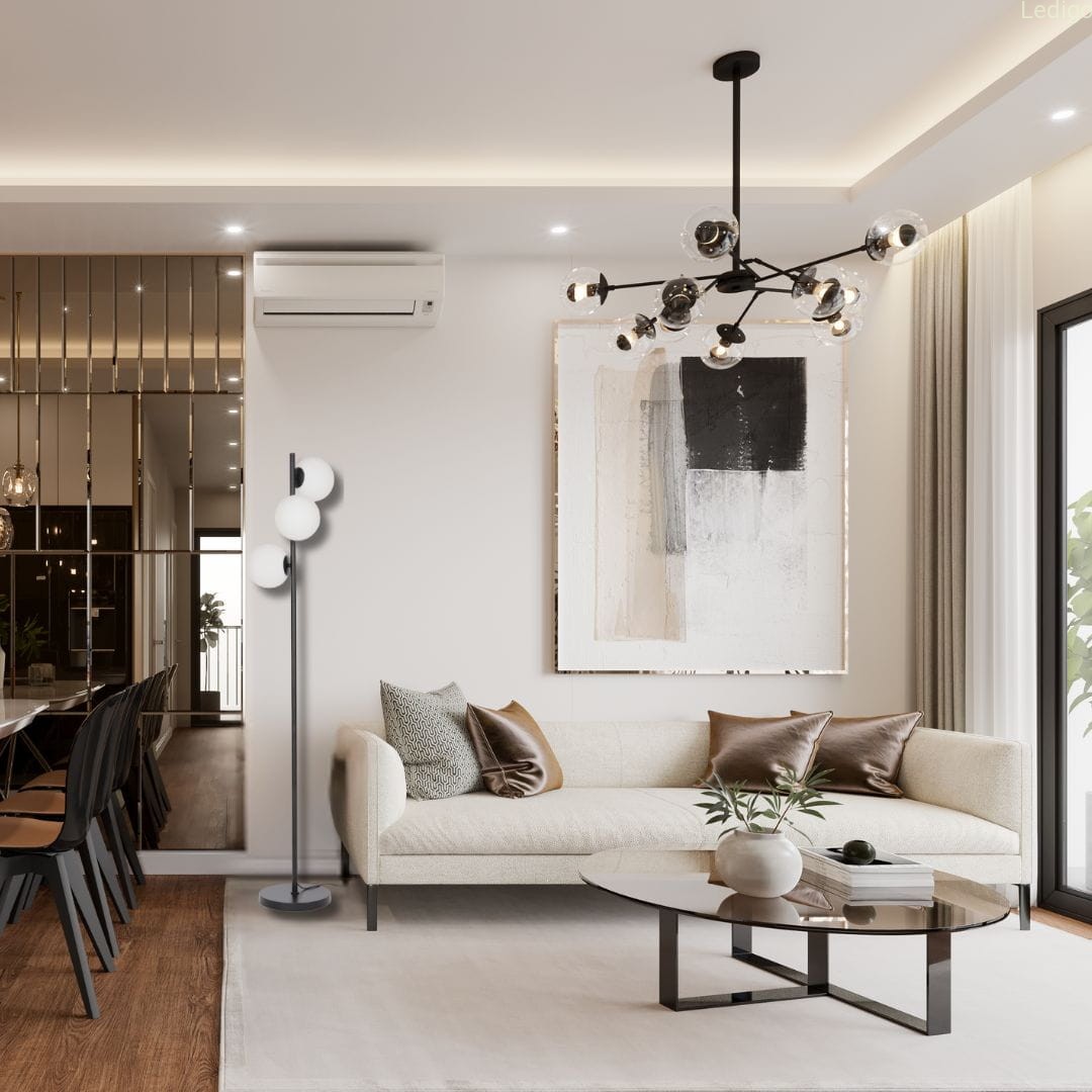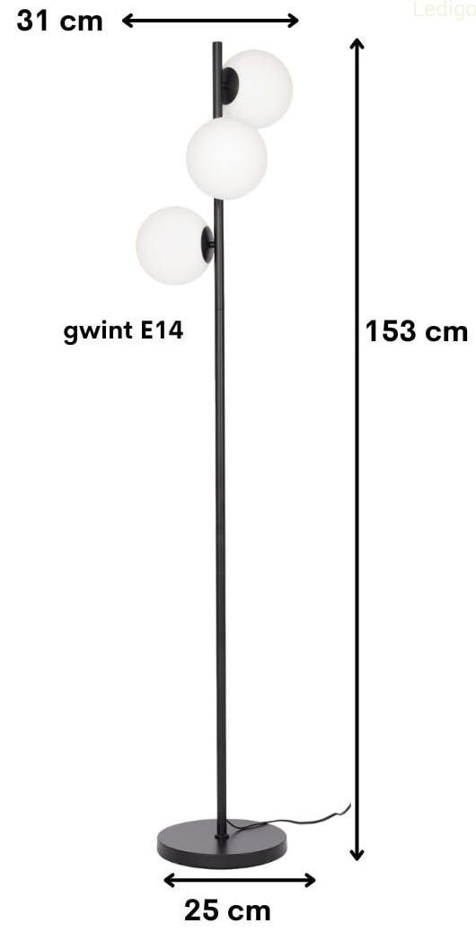 Szukasz stylowego dodatku, który doda wnętrzu blasku i charakteru? Ta lampa podłogowa to połączenie nowoczesnej elegancji i praktycznych rozwiązań. Trzy mleczne, szklane klosze delikatnie rozpraszają światło, tworząc przytulną atmosferę. Czerń w połączeniu z minimalistycznym designem sprawia, że lampa doskonale komponuje się zarówno w nowoczesnych, jak i klasycznych aranżacjach.