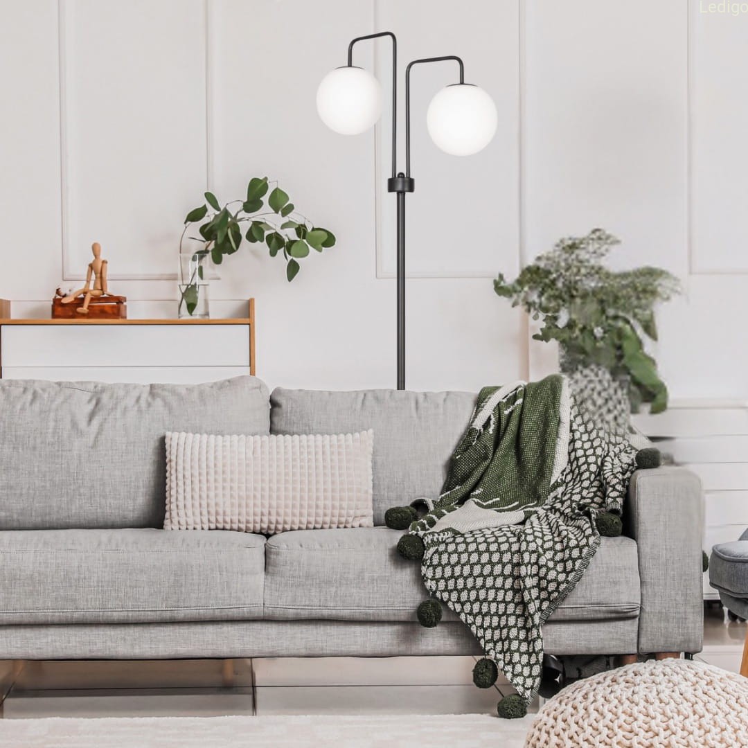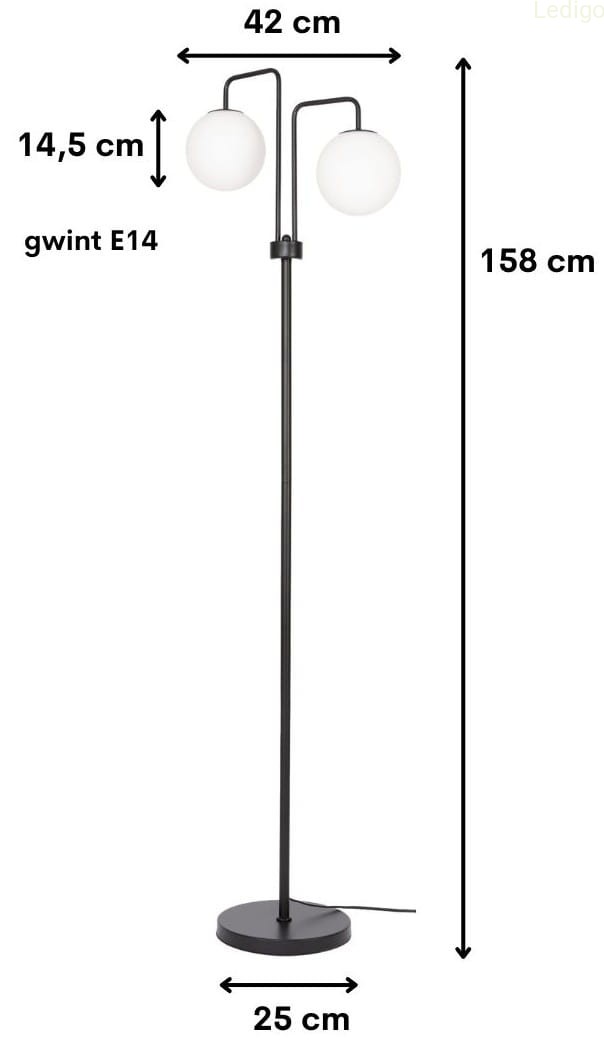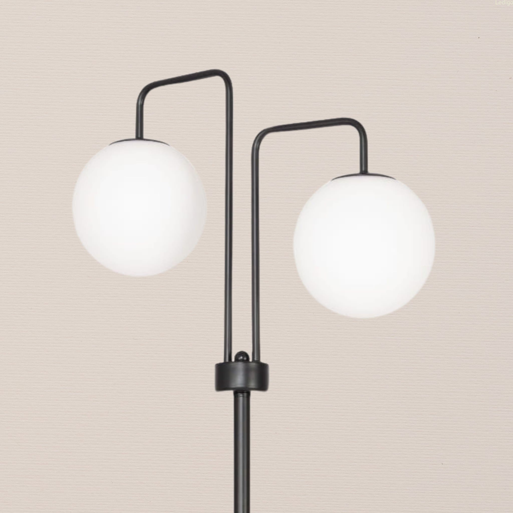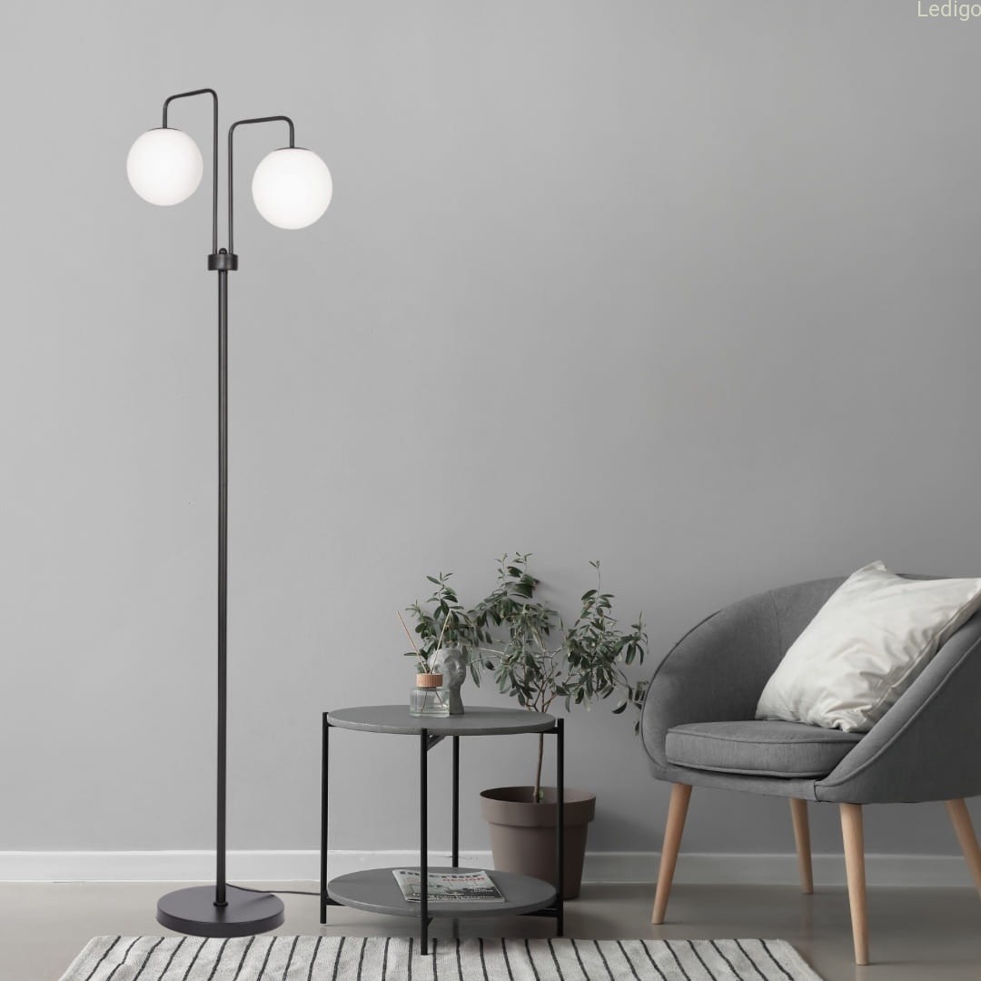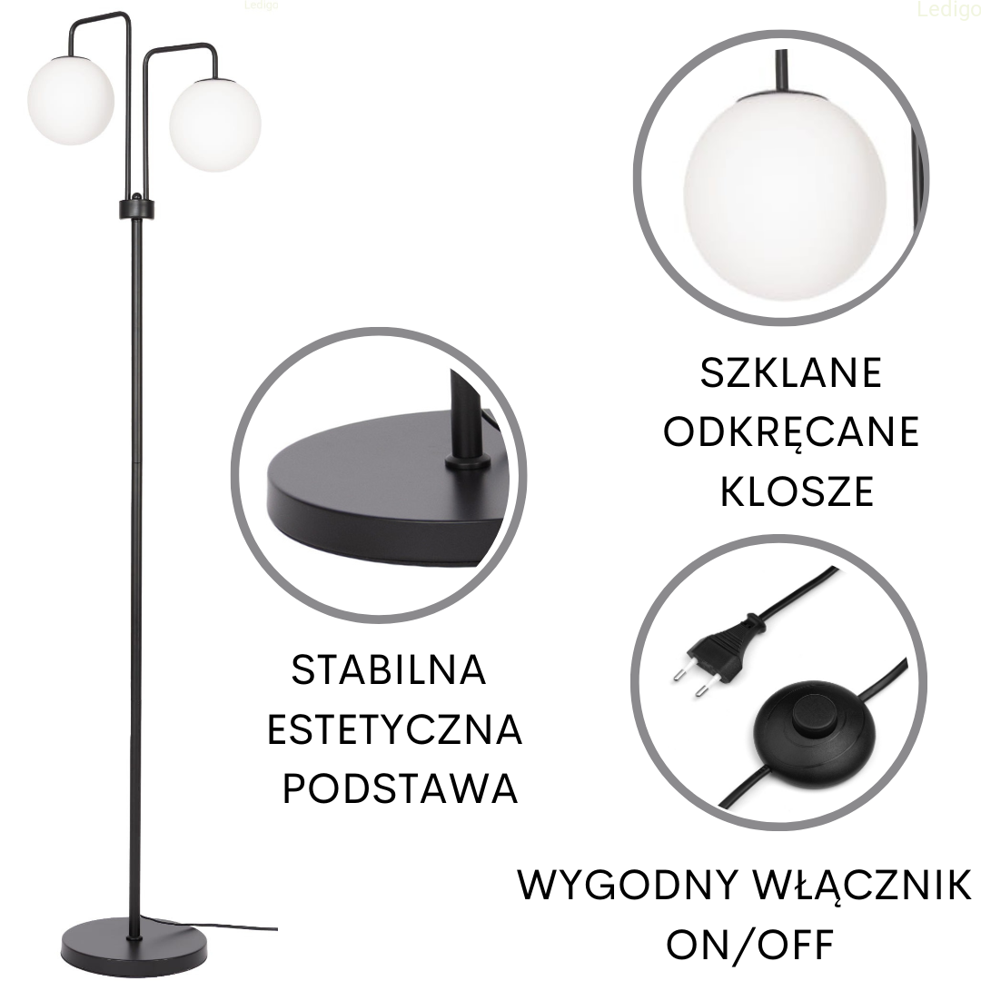 Szukasz stylowego dodatku, który doda wnętrzu blasku i charakteru? Ta lampa podłogowa to połączenie nowoczesnej elegancji i praktycznych rozwiązań. Dwa mleczne, szklane klosze delikatnie rozpraszają światło, tworząc przytulną atmosferę. Czerń w połączeniu z minimalistycznym designem sprawia, że lampa doskonale komponuje się zarówno w nowoczesnych, jak i klasycznych aranżacjach.