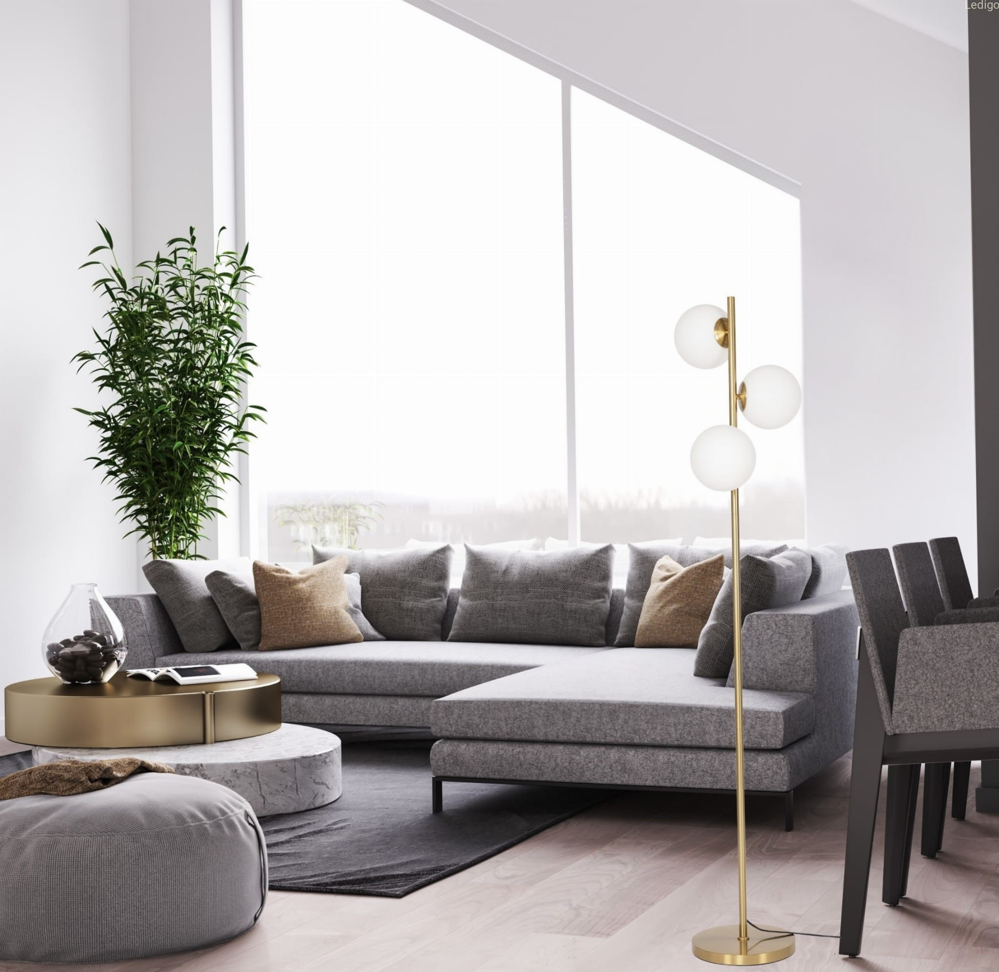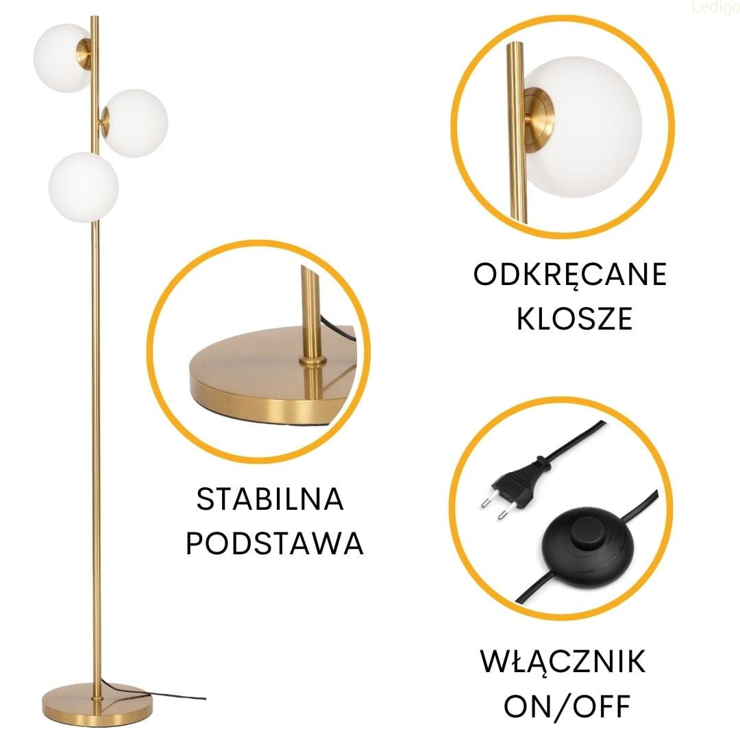 Szukasz stylowego dodatku, który doda wnętrzu blasku i charakteru? Ta lampa podłogowa to połączenie nowoczesnej elegancji i praktycznych rozwiązań. Trzy mleczne, szklane klosze delikatnie rozpraszają światło, tworząc przytulną atmosferę. Stonowane złoto w połączeniu z minimalistycznym designem sprawia, że lampa doskonale komponuje się zarówno w nowoczesnych, jak i klasycznych aranżacjach.