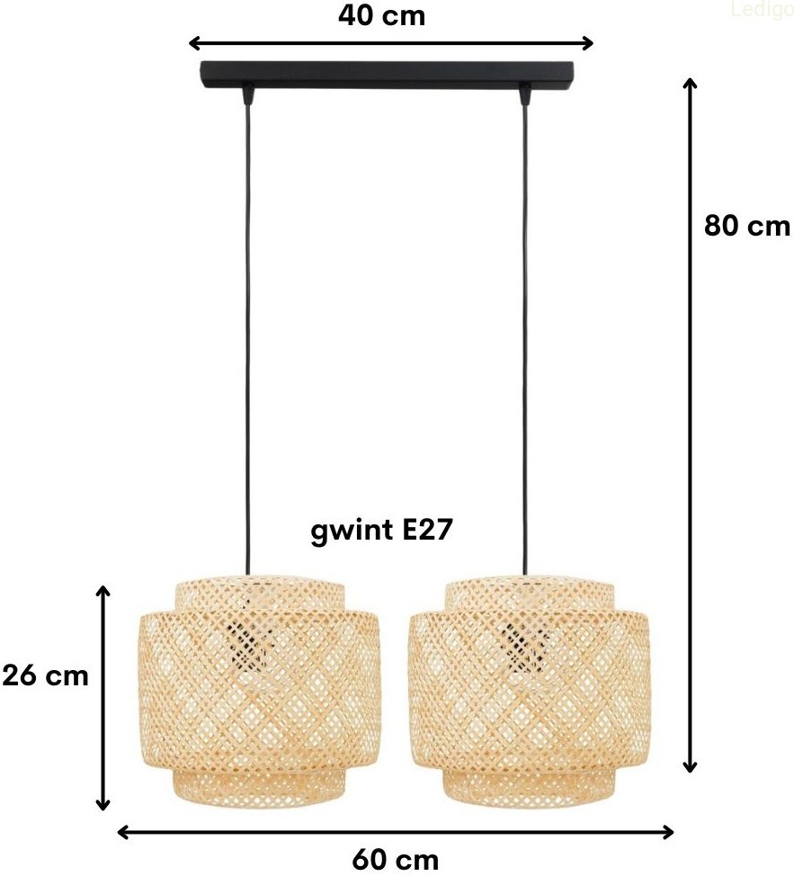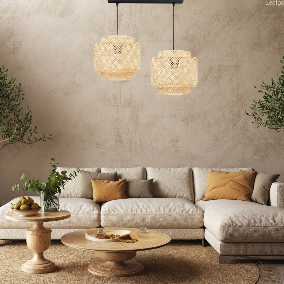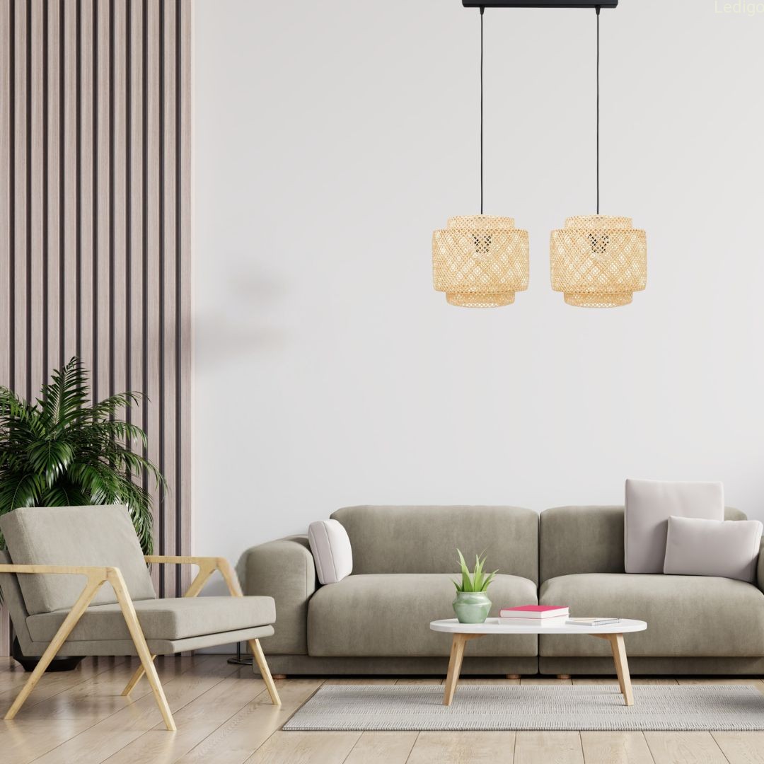 Dwa klosze bambusowe TH36 zwieszone na czarnej metalowej listwie to nie tylko oświetlenie, ale przede wszystkim rzemieślnicza dekoracja, która wprowadza do wnętrza spokój i ciepło natury. Lampa ta w wersji na podwójnej listwie doskonale sprawdza się jako oświetlenie nad stołem w jadalni lub wyspą kuchenną.