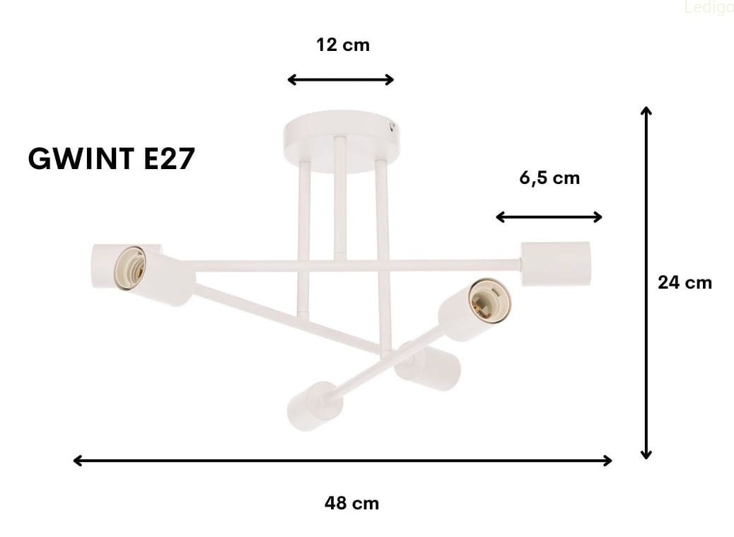 Każde z ramion zakończone jest klasyczną oprawą na żarówkę co zapewnia równomierne oświetlenie pomieszczenia..