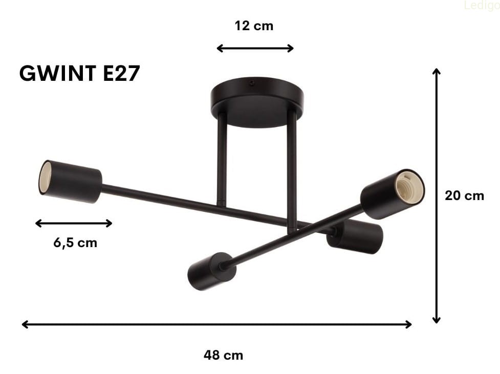 Każde z ramion zakończone jest klasyczną oprawą na żarówkę co zapewnia równomierne oświetlenie pomieszczenia..