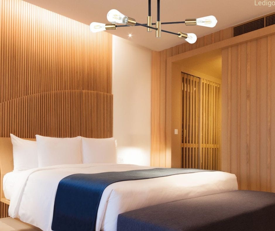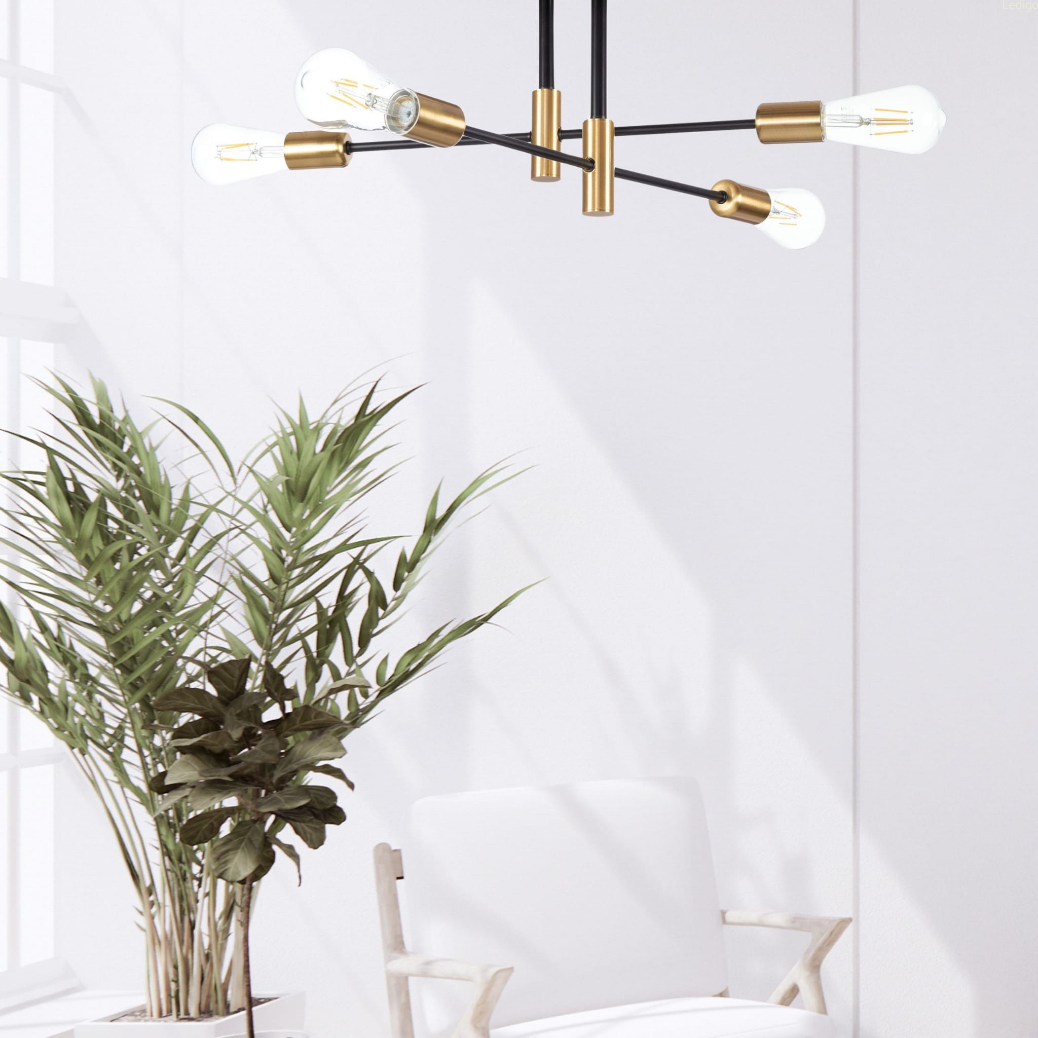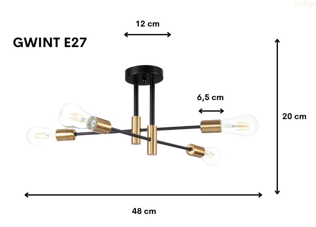Każde z ramion zakończone jest klasyczną złotą oprawą na żarówkę co zapewnia równomierne oświetlenie pomieszczenia.