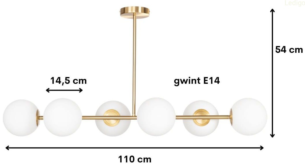 Rodzaj lampy: lampa sufitowa Dwuobwodowość: nie Rodzaj gwintu: E14 Styl: nowoczesny Tworzywo: metal + szkło Kolor klosza: mleczny Kolor uchwytu: złoty Kolor podstawy lampy: złoty Kolor kabla: czarny Kolor podsufitki: złoty Wysokość całkowita: 54cm Szerokość całkowita: 110cm Głębokość klosza: 14cm Uwaga! Należy zastosować żarówkę o maksymalnej wysokości 10 cm i średnicy 3,5cm Szerokość klosza: 14,5cm Wysokość klosza: 14,5cm Średnica maskownicy: 12cm Waga produktu: 3,500kg Możliwość ściemniania: w zależności od żarówki Stopień ochrony IP: IP20 Regulacja wysokości: nie Napięcie: 230V Źródło światła w zestawie: nie Czas realizacji: 24h