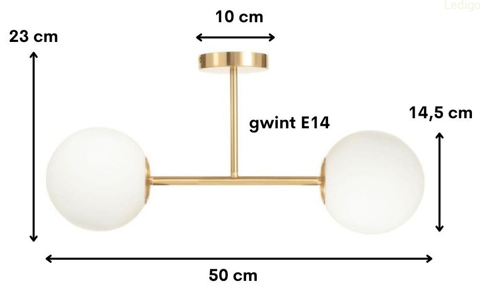 Rodzaj lampy: lampa sufitowa Dwuobwodowość: nie Rodzaj gwintu: E14 Styl: nowoczesny Tworzywo: metal + szkło Kolor klosza: mleczny Kolor uchwytu: złoty Kolor podsufitki: złoty Wysokość całkowita: 23cm Szerokość całkowita: 50cm Głębokość klosza: 14cm Uwaga! Należy zastosować żarówkę o maksymalnej wysokości 10 cm Szerokość klosza: 14,5cm Wysokość klosza: 14,5cm Średnica maskownicy: 10cm Waga produktu: 1,600kg Możliwość ściemniania: w zależności od żarówki Stopień ochrony IP: IP20 Regulacja wysokości: nie Napięcie: 230V Źródło światła w zestawie: nie Czas realizacji: 24h
