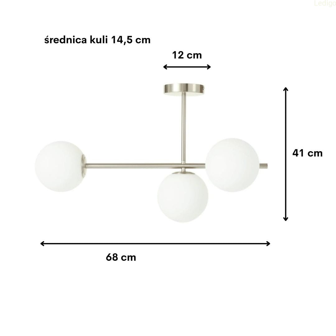 Lampa posiada poziomą konstrukcję w kolorze srebrnym (szczotkowanym), na której końcach osadzone są trzy klosze.