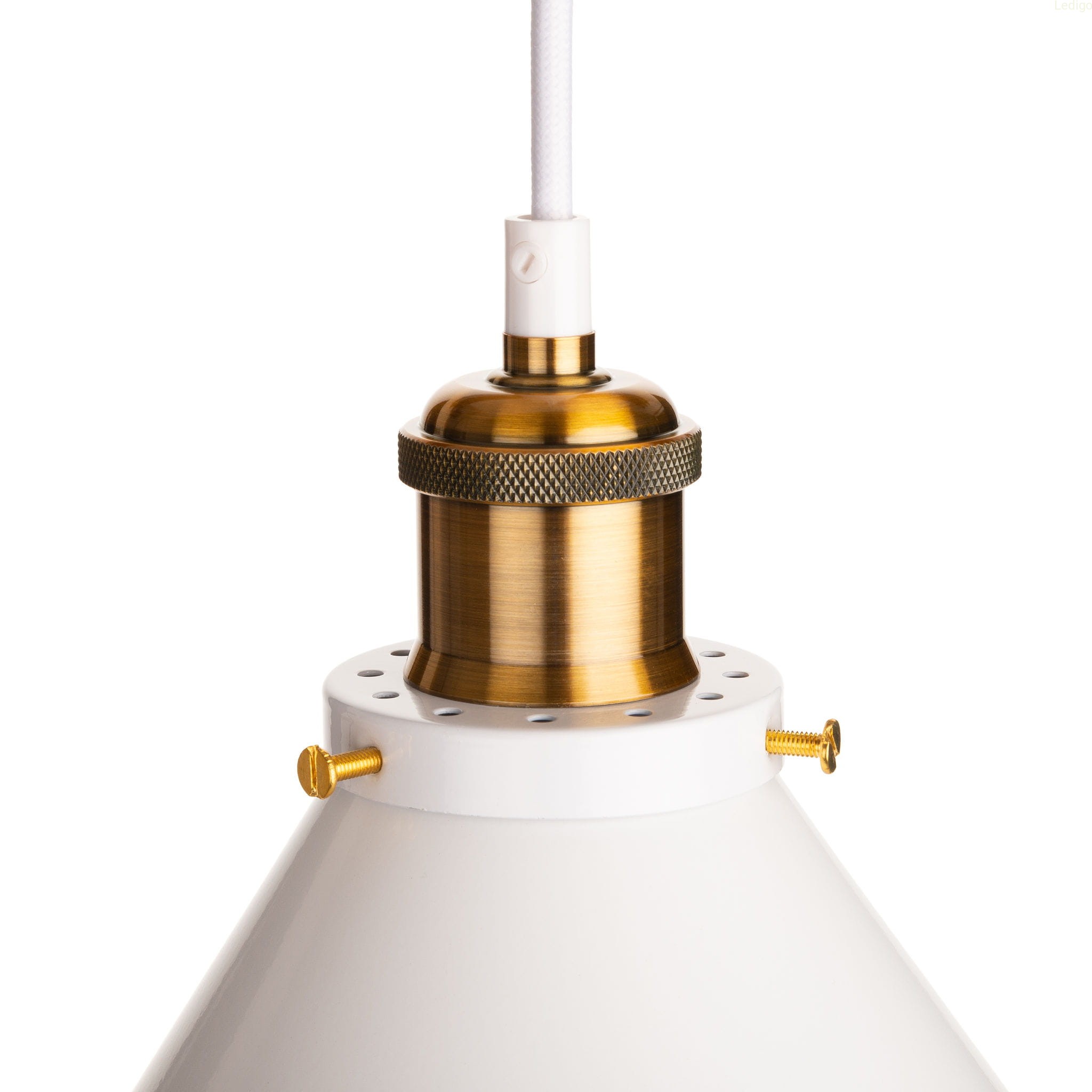Rodzaj lampy:plafonDwuobwodowość:nieStyl:nowoczesnyTworzywo:metalKolor klosza:białyKolor uchwytu:Stare złotoKolor kabla:BiałyKolor podsufitki:biała, okrągła metalowaWymiary:Wymiary w załączonym zdjęciu podglądowymRegulacja wysokości:takNapięcie:230VŹródło światła w zestawie:nieCzas realizacji:24h