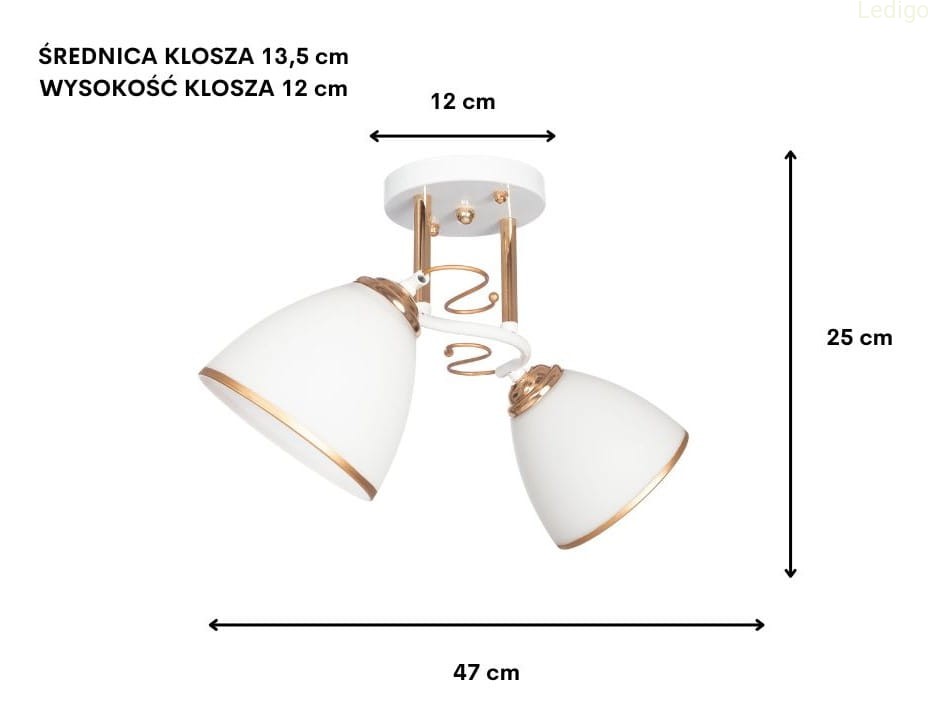 Żyrandol wykonany jest z metalu w kolorze białym z elementami złota. Uroku dodają mu dwa delikatne małe szklane białe klosiki wykończone złotym paskiem.