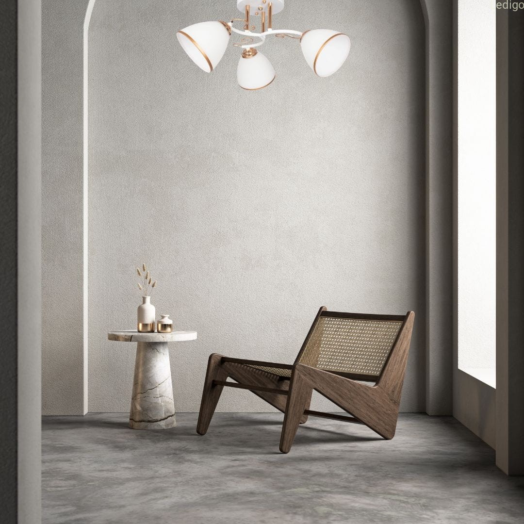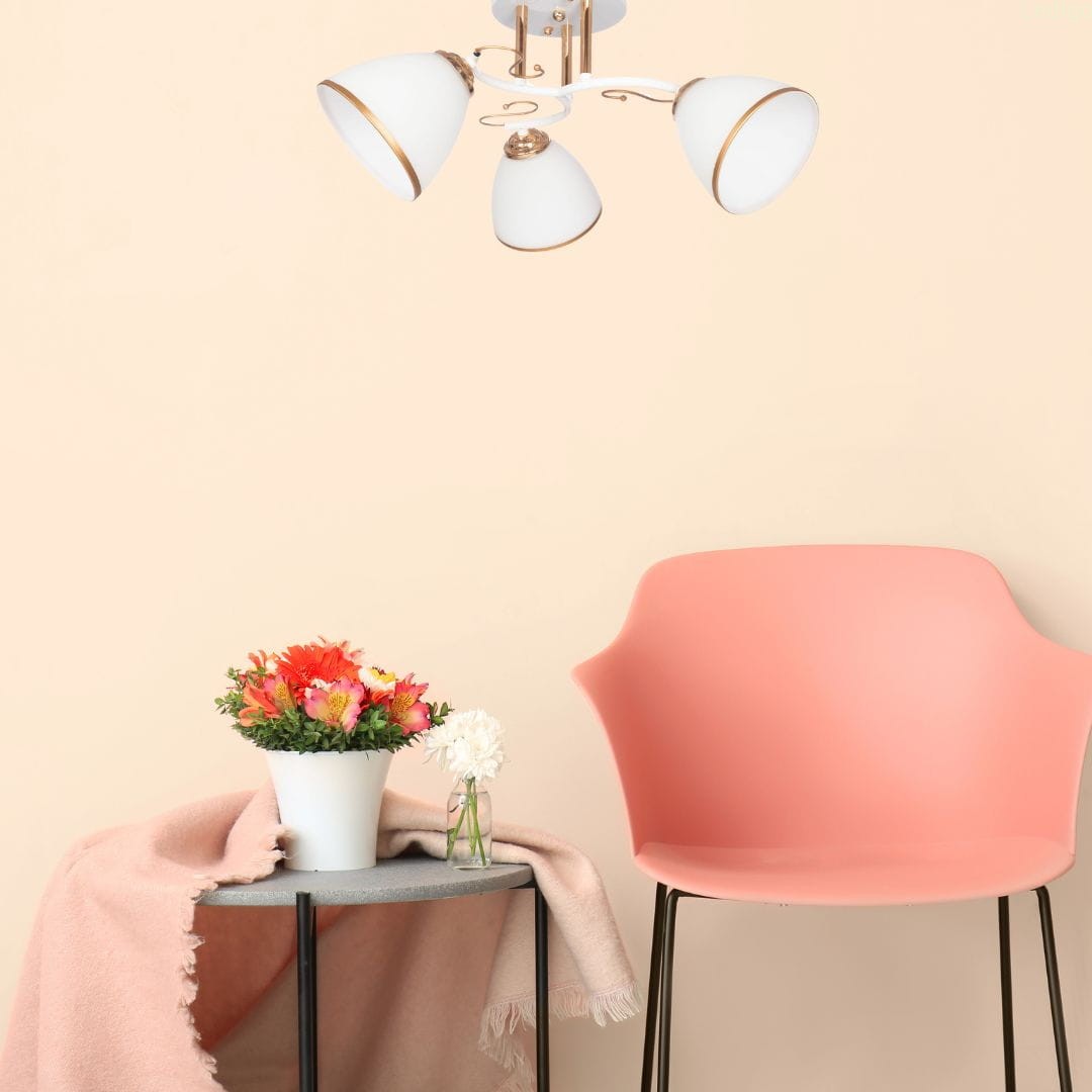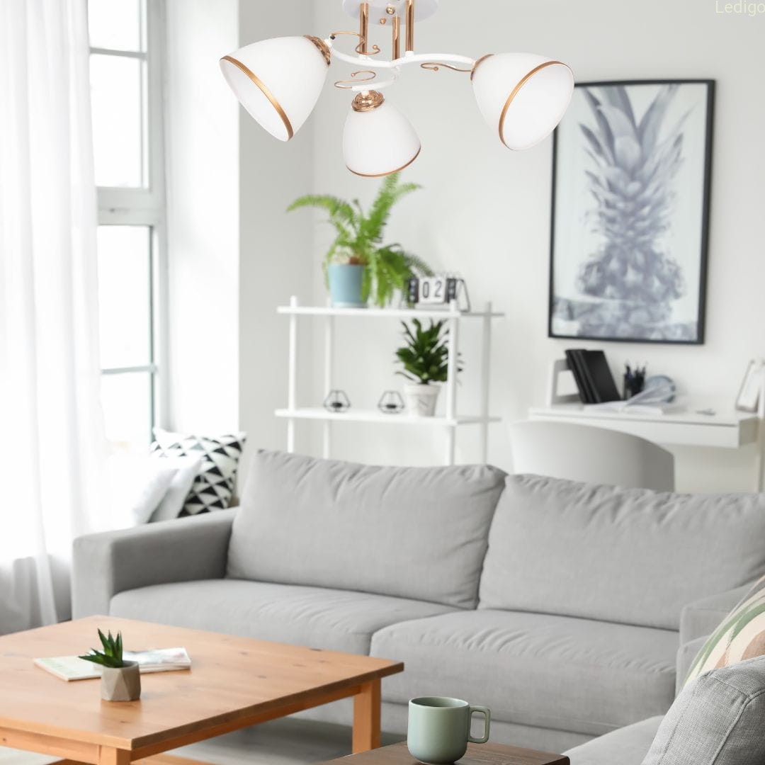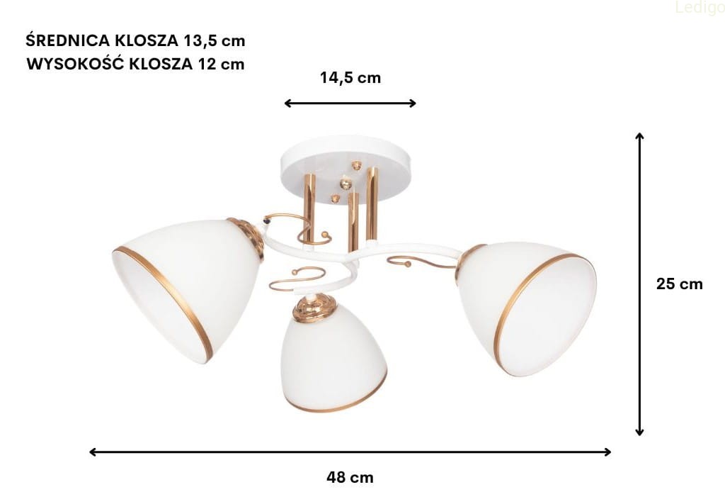 Żyrandol wykonany jest z metalu w kolorze białym z elementami złota. Uroku dodają mu trzy delikatne małe szklane białe klosiki wykończone złotym paskiem.