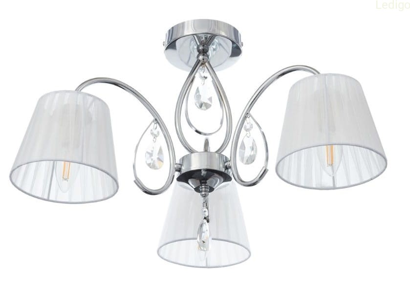 Rodzaj lampy: lampa sufitowa Dwuobwodowość: nie Rodzaj gwintu: E14 Styl: nowoczesny Tworzywo: metal + materiał + kryształ Kolor klosza: biały Kolor uchwytu: Chrom Kolor podsufitki: Srebrna metalowa Wymiary: Wysokość zamontowanej lampy 30 cm, szerokość zamontownej lampy 50 cm, szerokość pojedynczego ramienia 16 cm, wysokość abażuru 11,5 cm, średnica górnego otworu abażuru 9,5 cm, średnica dolnego otworu abażuru 15 cm Regulacja wysokości: nie Napięcie: 230V Źródło światła w zestawie: nie Czas realizacji: 24h