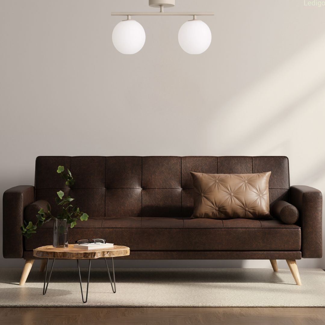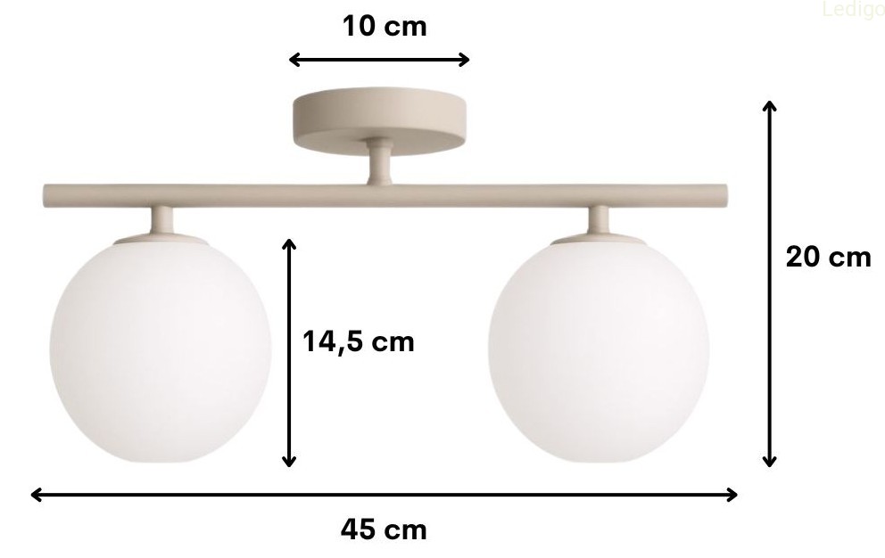 Lampa posiada poziomą konstrukcję w kolorze beżowym (kaszmirowym), na której końcach osadzone są dwa klosze.