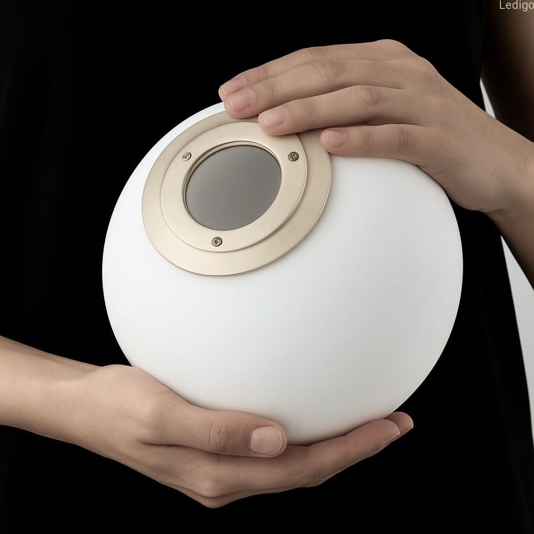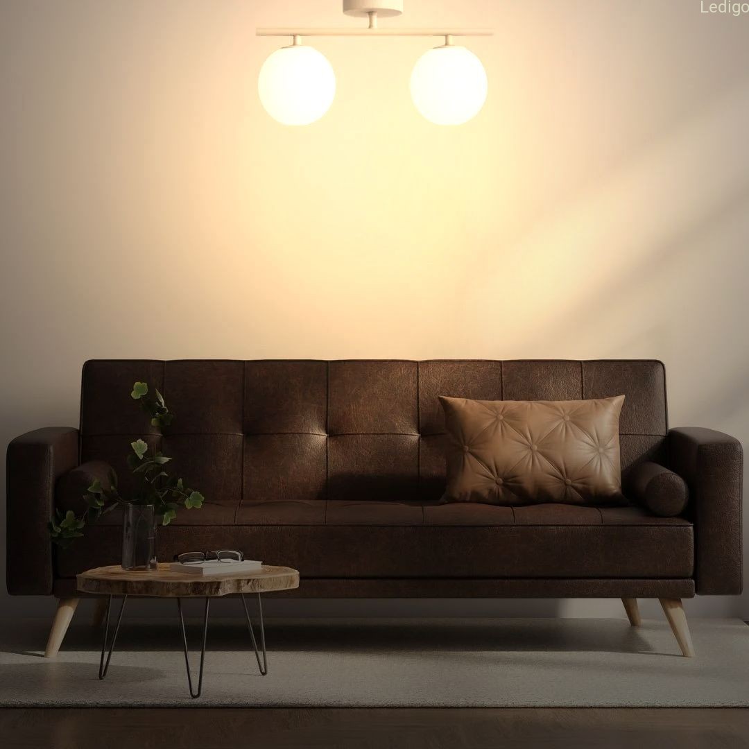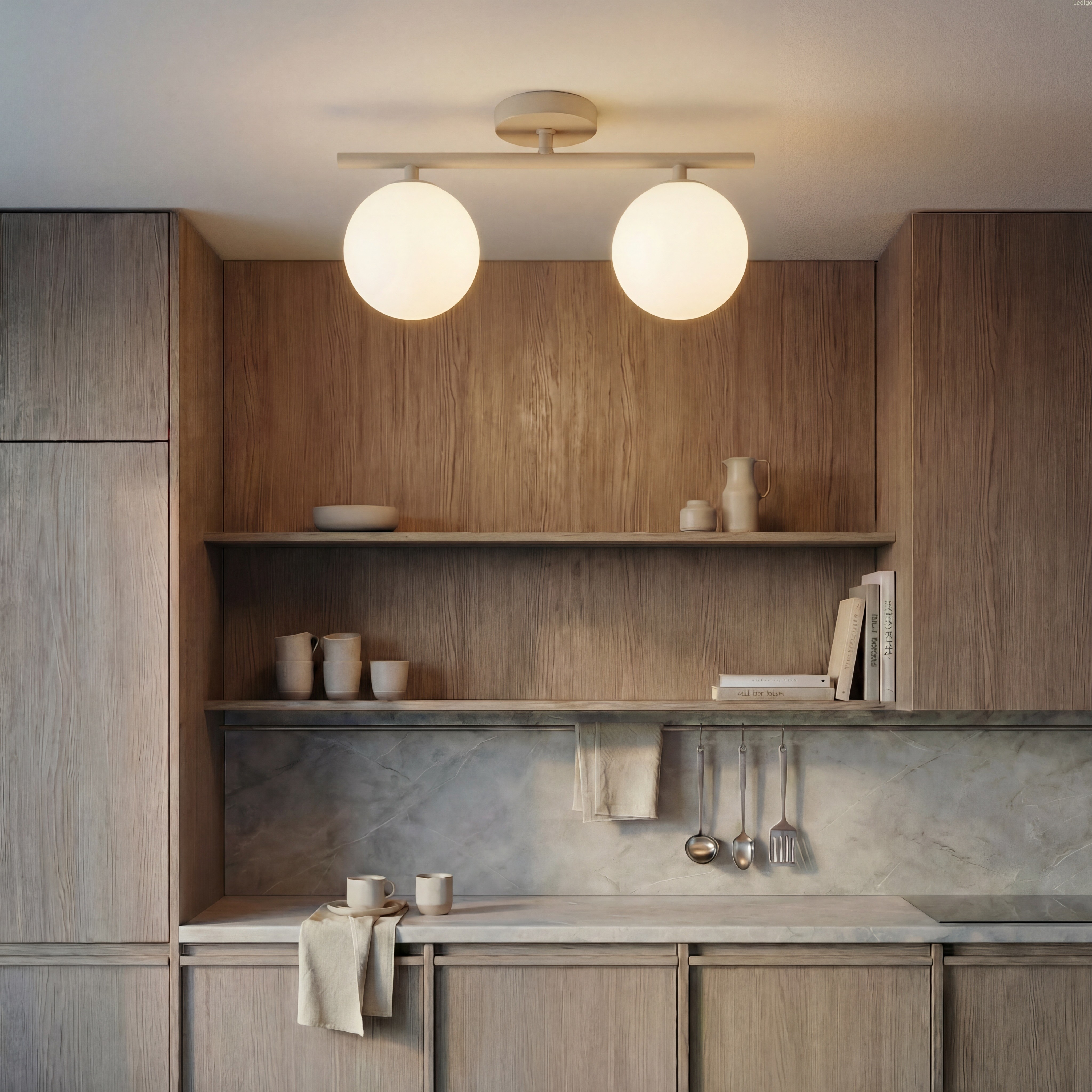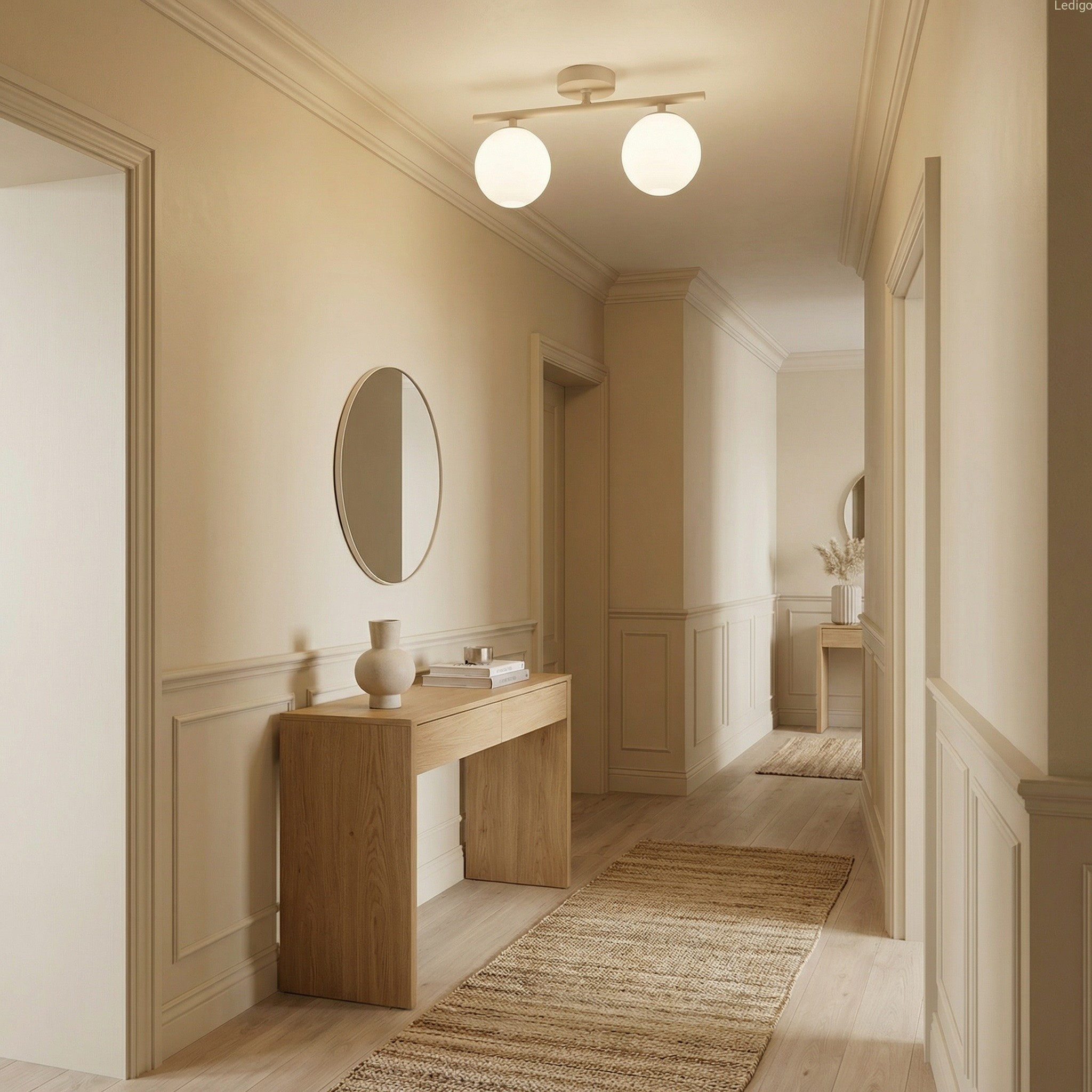 Dwa klosze z mlecznego, matowego szkła przypominają idealne perły. Dzięki swojej strukturze zamieniają surowe światło żarówek w kojącą, miękką poświatę, która nie razi w oczy, a otula pomieszczenie przytulnością.