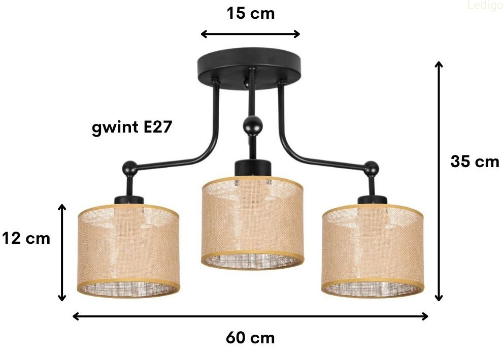 Prezentujemy lampę sufitową w loftowej stylistyce z elementami. Lampa wykonana jest z metalu i posiada abażury z naturalnej juty. Świetnie wpisuje się w nowoczesne i wnętrza inspirowane naturą. Abażury są odkrecane co daje możliwość zmiany aranżacyjnej. Lampa świetnie zaprezentuje się w salonie, kuchni, czy pokoju dziecięcym.