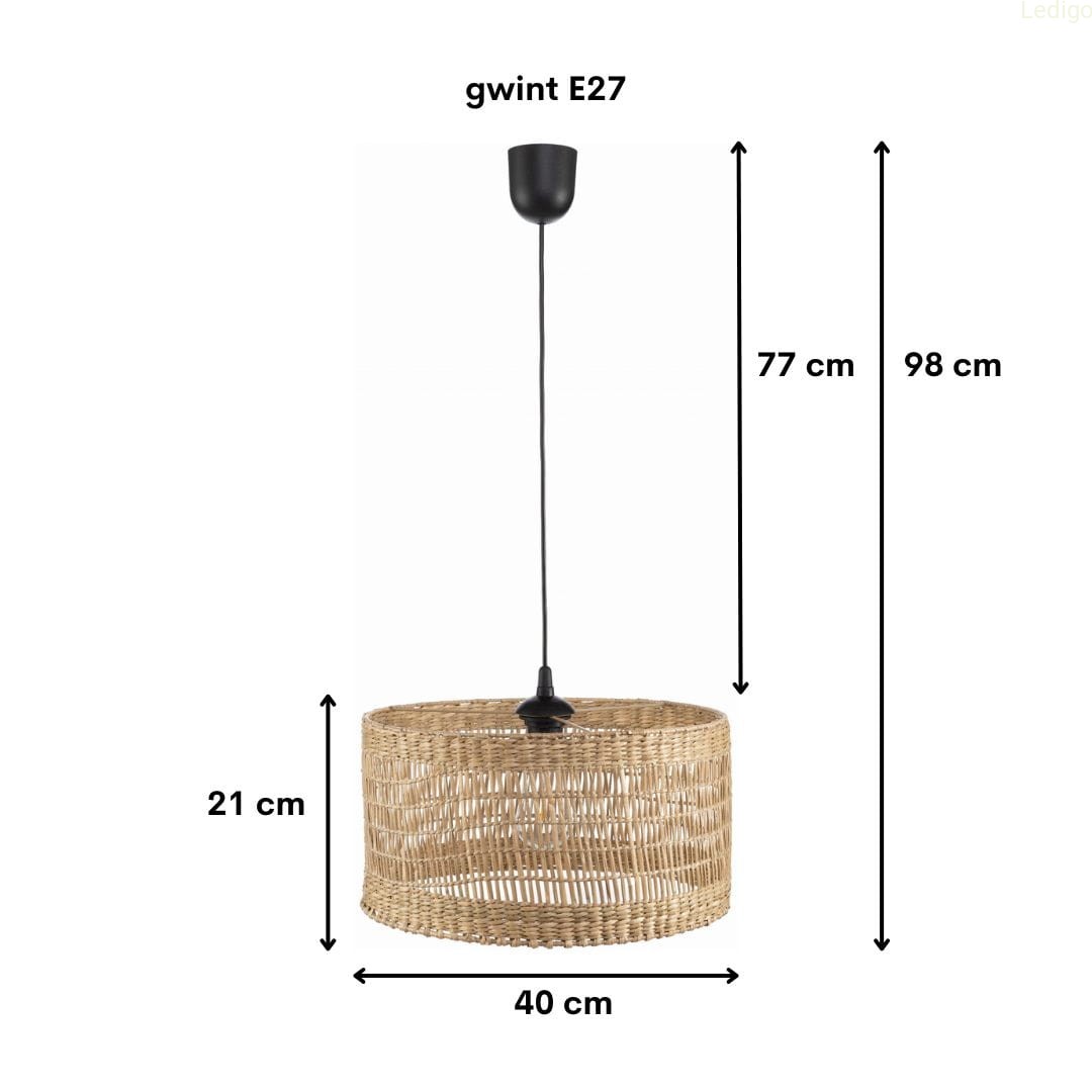 Design: Lampa ma okrągły, cylindryczny klosz wykonany z ręcznie plecionej trawy morskiej, co nadaje jej tekstury i naturalnego wyglądu. Splot jest otwarty, co pozwala na filtrowanie światła i tworzenie miękkiej, przytulnej atmosfery w pomieszczeniu.