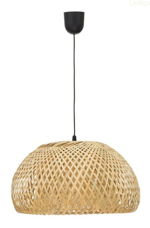 Klosz lampy został ręcznie wykonany z drewna bambusowego. Plecionka w zaokrąglonej formie wywija się ku dołowi a podwójny splot sprawia że światło jeszcze piękniej przenika przez ażurową formę klosza. Lampa ma kształt kopuły.
