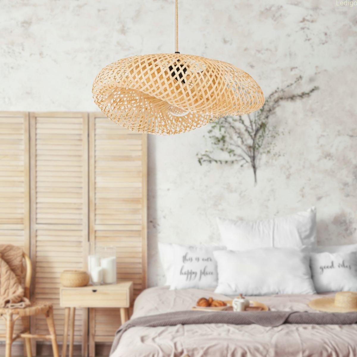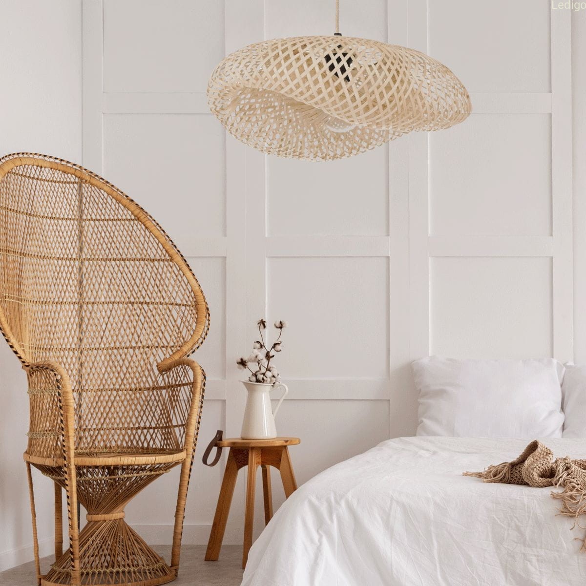 - gra światła i cienia - kluczem do uroku tego modelu jest jego ażurowa konstrukcja. Ręcznie pleciony bambus nie blokuje światła, lecz subtelnie je filtruje. Po włączeniu lampy, na ścianach i suficie pojawia się widowiskowa mozaika cieni, która buduje przytulny klimat.