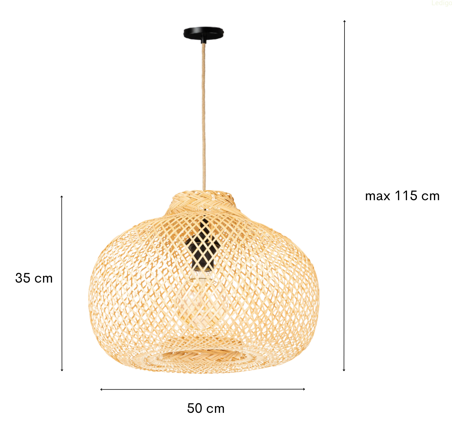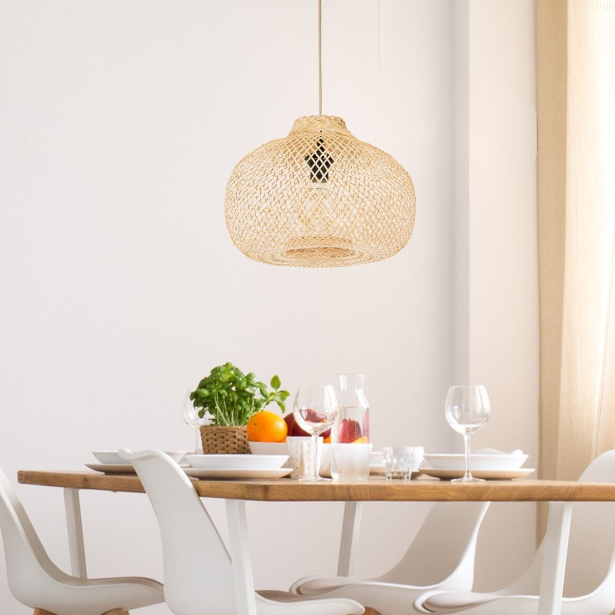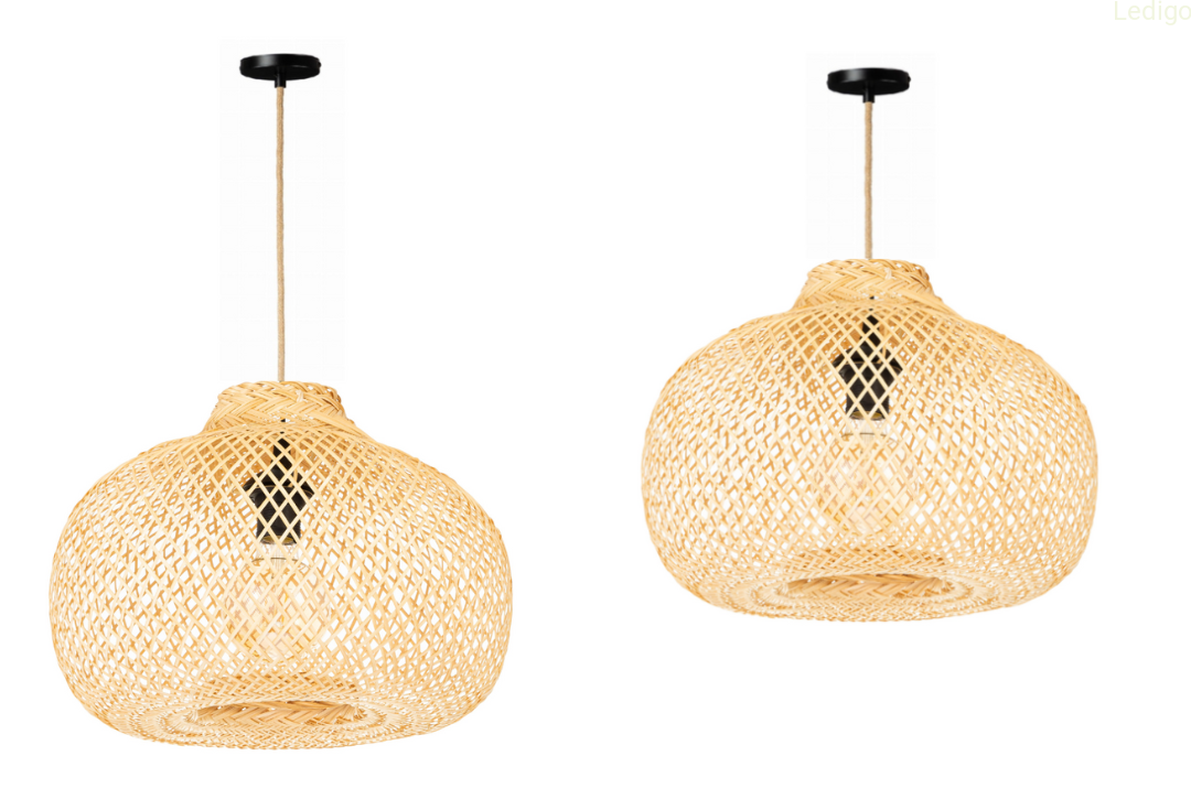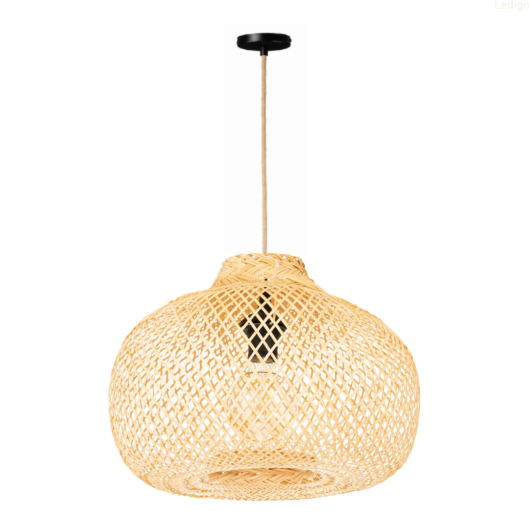 EKO DESIGN - klosz lampy wykonany jest bambusowej plecionki. Pięknie nawiązuje do natury. Ażurowa forma lampy pozwala przenikać światłu dzięki czemu lampa daje piękną poświatę. Nasz lampa świetnie wygląda umieszczona nad stołem w jadalni, nad sofą w salonie czy miejscem do pracy w domowym biurze.