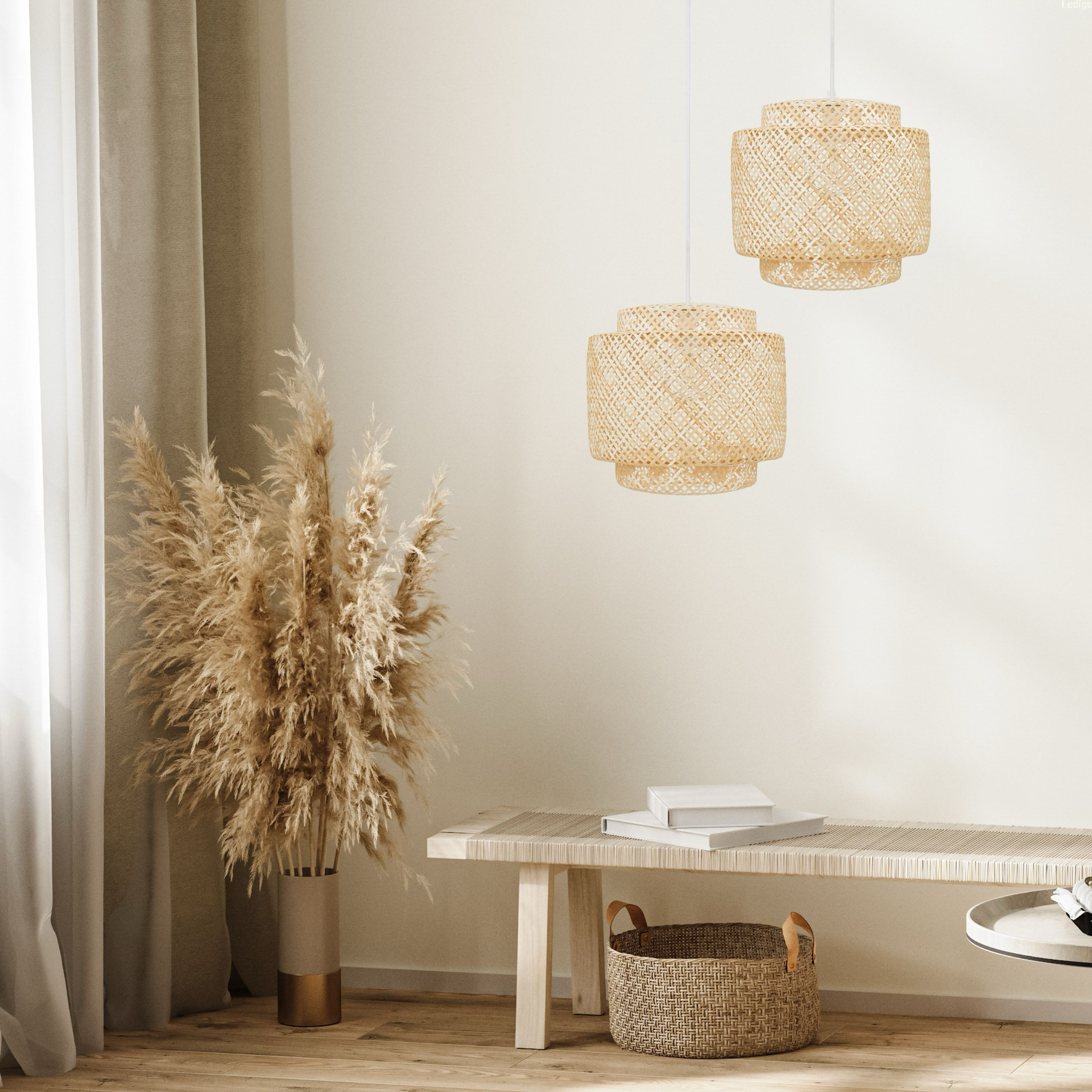 Rodzaj lampy: lampa wisząca Dwuobwodowość: nie Rodzaj gwintu: E27 Styl: boho Tworzywo: bambus Kolor klosza: beżowy Kolor uchwytu: biały Kolor kabla: biały Kolor podsufitki: biały Wysokość całkowita: 99cm Szerokość całkowita: 28cm Szerokość klosza: 28cm Wysokość klosza: 27cm Średnica maskownicy: 10cm Waga produktu: 0,900g Możliwość ściemniania: w zależności od żarówki Stopień ochrony IP: IP20 Regulacja wysokości: tak Napięcie: 230V Źródło światła w zestawie: nie Czas realizacji: 24h