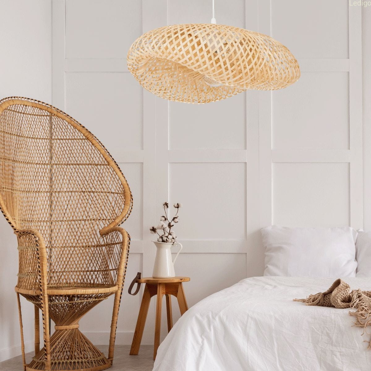 - gra światła i cienia - kluczem do uroku tego modelu jest jego ażurowa konstrukcja. Ręcznie pleciony bambus nie blokuje światła, lecz subtelnie je filtruje. Po włączeniu lampy, na ścianach i suficie pojawia się widowiskowa mozaika cieni, która buduje przytulny klimat.