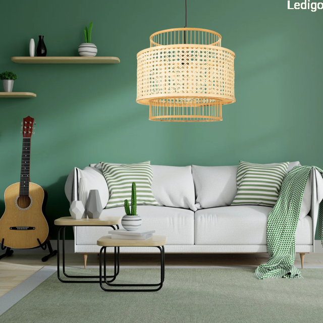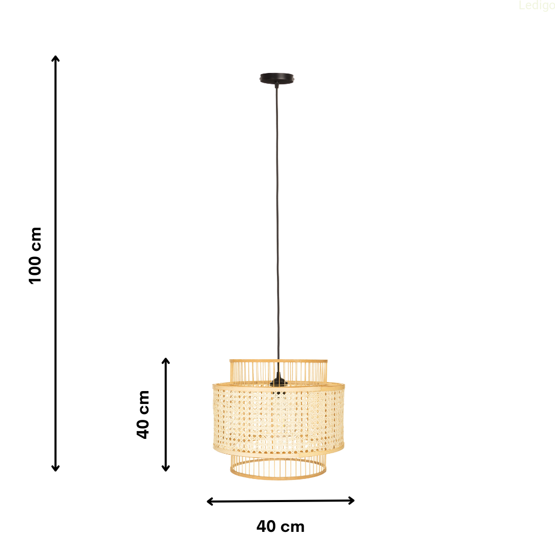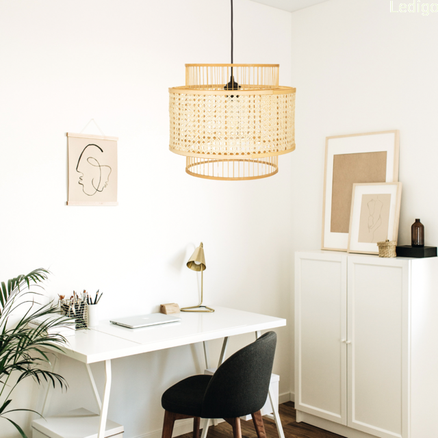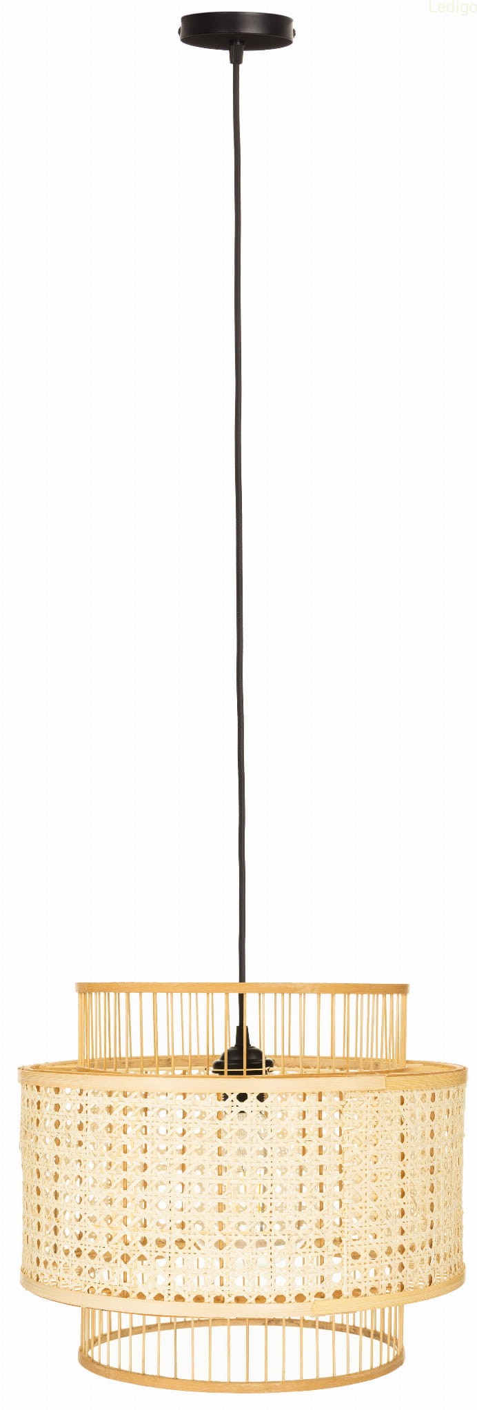 Klosz lampy został ręcznie wykonany z drewna bambusowego. Trzy części klosza są zintegrowane tworząc piękną lampę w całości. Dzięki swoim rozmiarom lampa znakomicie sprawdzi się jako główne oświetlenie salonu, kuchni czy sypialni. Plecionka pozwala przenikać światłu dzięki czemu lampa tworzy piękny klimat w pomieszczeniu.